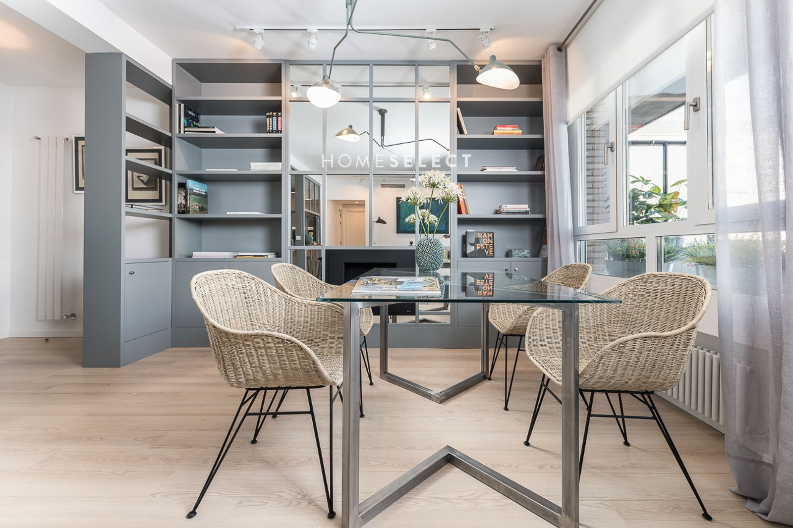 Se compone de una cocina, salón/comedor, dos dormitorios, dos baños y una terraza. La cocina, completamente equipada, cuenta con unidades de colores claros que contrastan con los paneles negros situados entre los armarios y la encimera, configurando un espacio elegante. Una gran pared de vidrio divide la cocina del salón/comedor, lo que crea una sensación de planta abierta a pesar de que las estancias están separadas. Una pequeña escotilla con una barra de desayuno está integrada en la pared de vidrio, lo que suma a la apariencia de estar todo integrado en un mismo espacio. La mesa del comedor, separada del salón por una estantería, tiene cuatro asientos de mimbre y está colocada contra una pared de espejo, dando la impresión de una mayor amplitud.