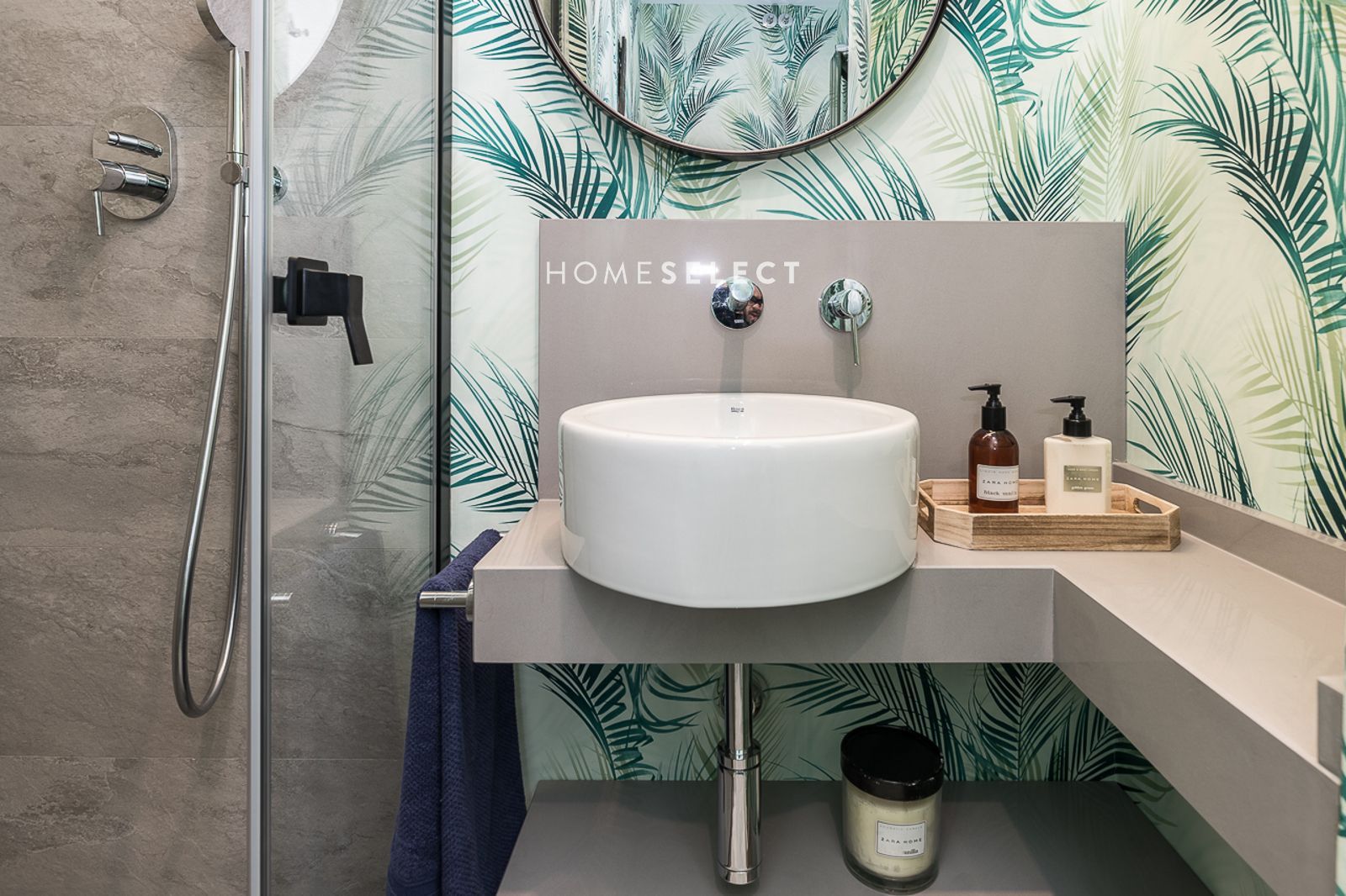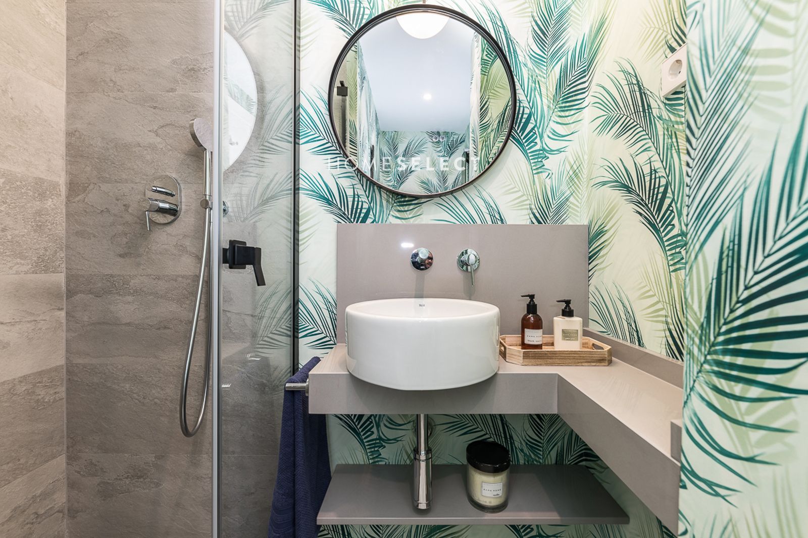 El dormitorio principal cuenta con una cama doble, amplios armarios empotrados y una decoración muy minimalista en tonos grises y blancos, mientras que el segundo, equipado con una cama individual, dispone además de un escritorio donde poder trabajar. Ambas habitaciones destacan por su luminosidad, conseguida gracias al empleo de tonos blancos y a la disposición de grandes ventanas que permiten el paso de gran cantidad de luz natural. Por otra parte, los baños siguen la misma estética moderna y elegante del resto de la casa. El más pequeño dispone de una cabina de ducha acristalada y un bonito papel de pared con motivos tropicales. El otro cuenta con una espaciosa bañera y un diseño monocromático. Una de las joyas de este piso es la terraza que se encuentra equipada con una mesita redonda y dos asientos, donde los huéspedes podrán disfrutar de un momento de lectura o agradables comidas al aire libre.