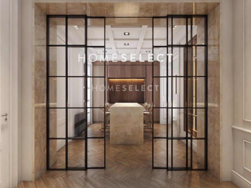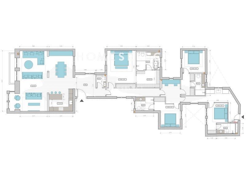 Una posible distribución sería la siguiente: nada más entrar en la vivienda, el vestíbulo nos conduce hacia un majestuoso salón comedor (de suelo de madera acabado en roble), comunicado con la cocina visualmente abierta de la marca GUNNI & TRENTINO, o similar, y equipada con electrodomésticos de la marca GAGGENAU. A su vez, conecta con una segunda cocina independiente para uso diario y un baño de invitados. La zona de noche está compuesta por tres dormitorios y tres baños, dos de ellos en suite.
