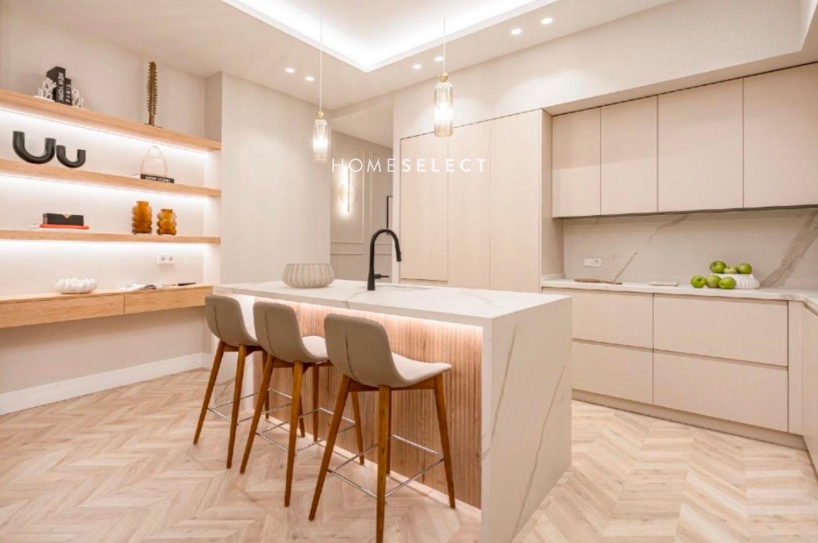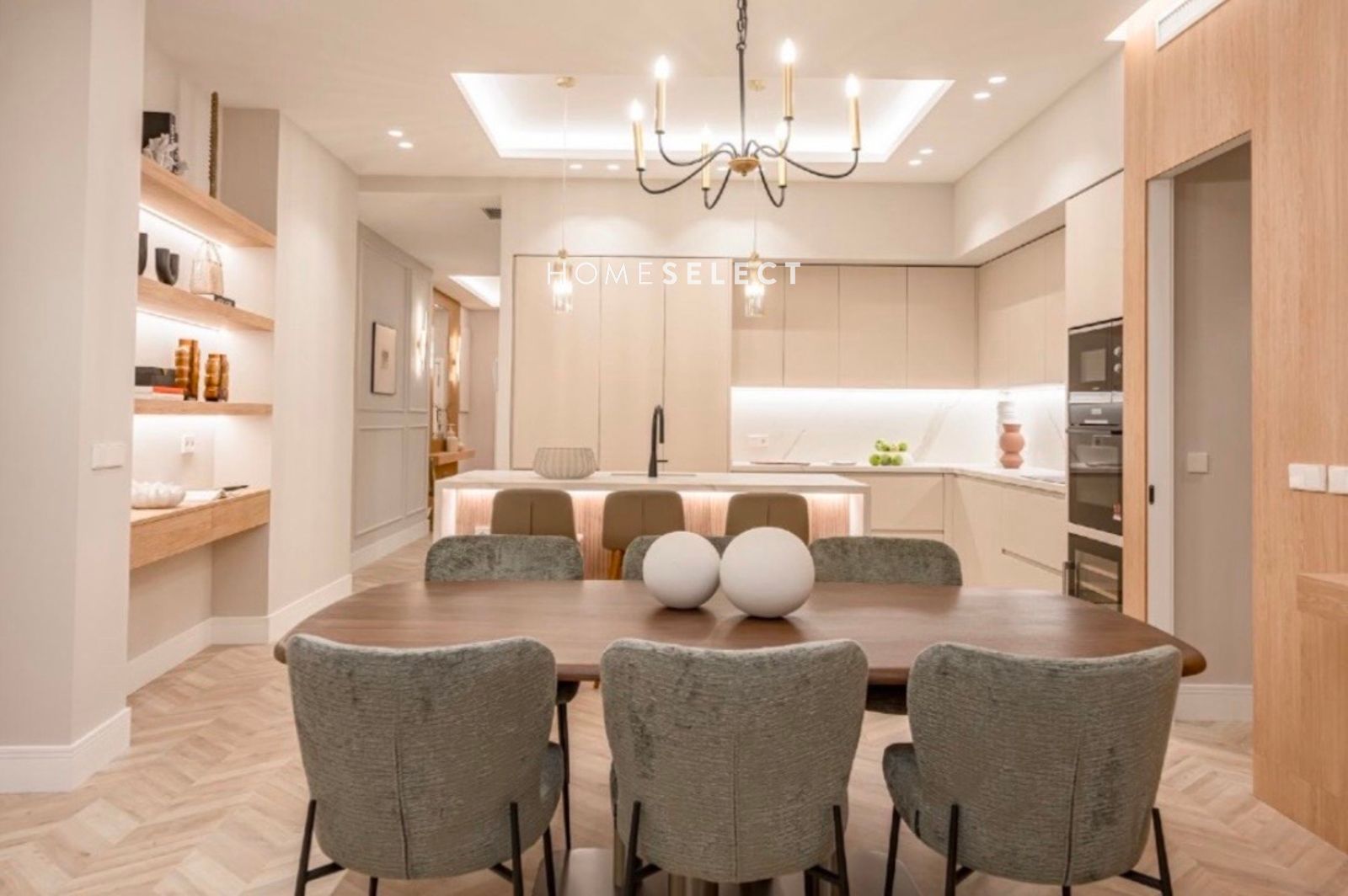 El área social destaca por su amplitud y modernidad, compuesta por un gran salón-comedor. La cocina se integra en este espacio con una gran isla central que se convierte en el núcleo de la estancia. Esta zona se completa con una sala de estar independiente, un práctico aseo de invitados y un cuarto de lavandería totalmente equipado para mayor funcionalidad.