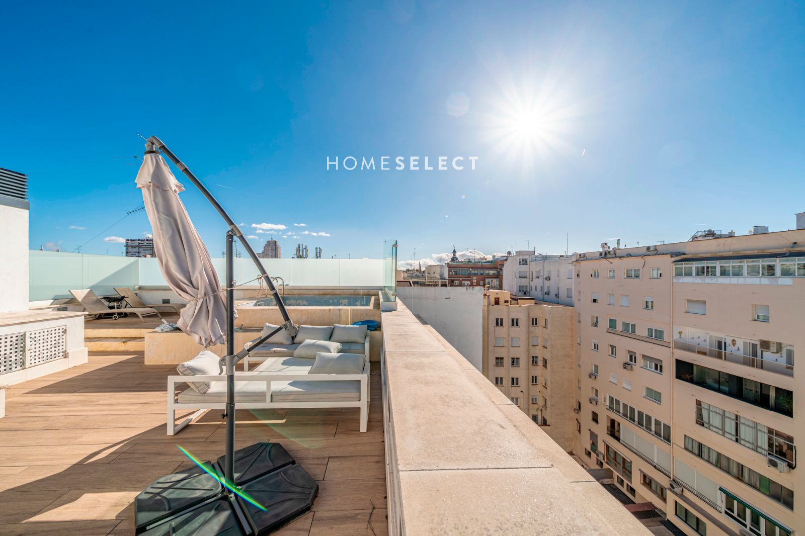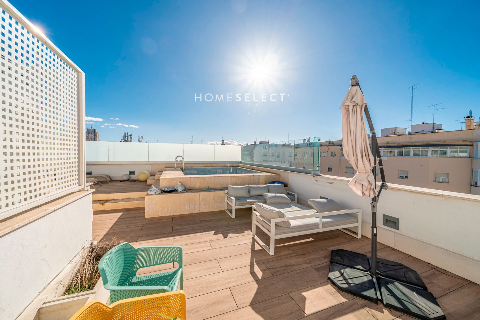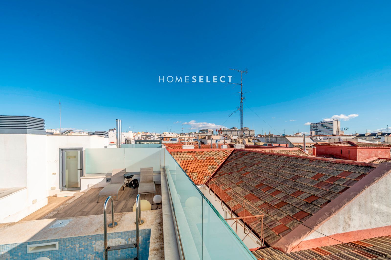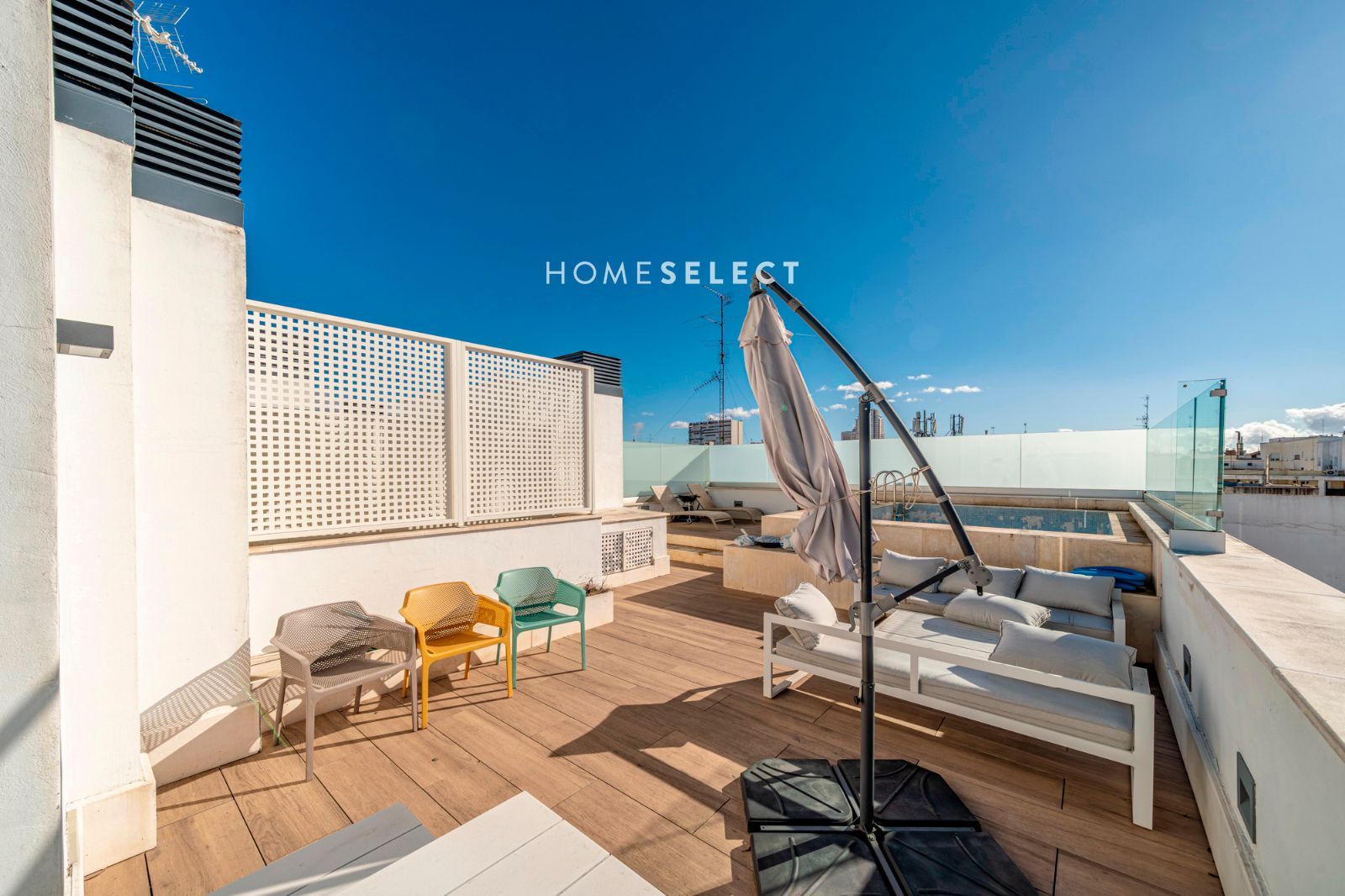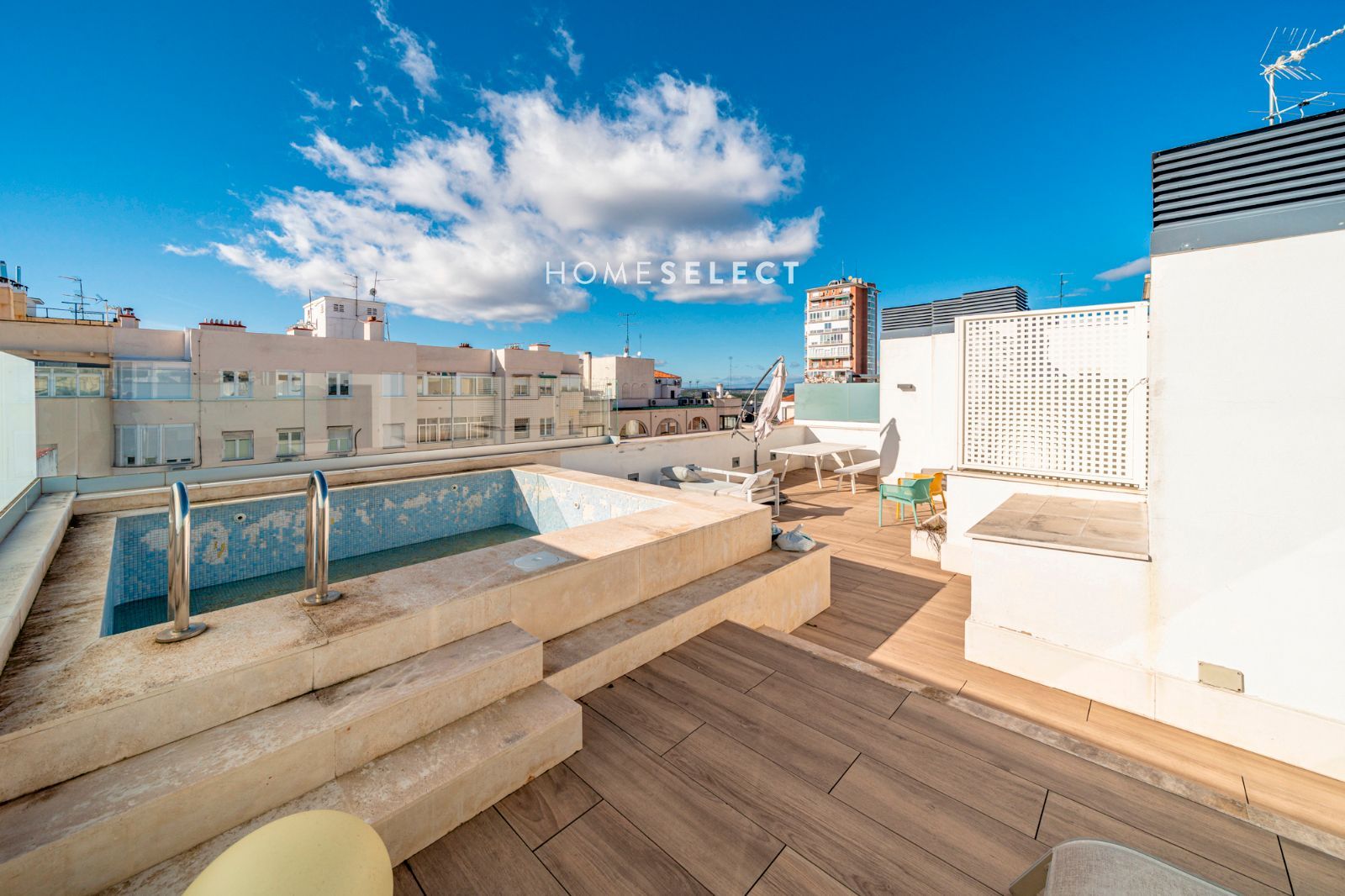 Desde la vivienda se accede a la planta superior, donde se ubica una espectacular terraza privada, auténtico valor diferencial del ático. Este espacio exterior, de generosas dimensiones, cuenta con piscina privada y permite disfrutar de distintos ambientes —zona de descanso, comedor al aire libre o solárium— gracias a sus tres orientaciones (sur, este y oeste), que garantizan sol y luminosidad durante todo el día.