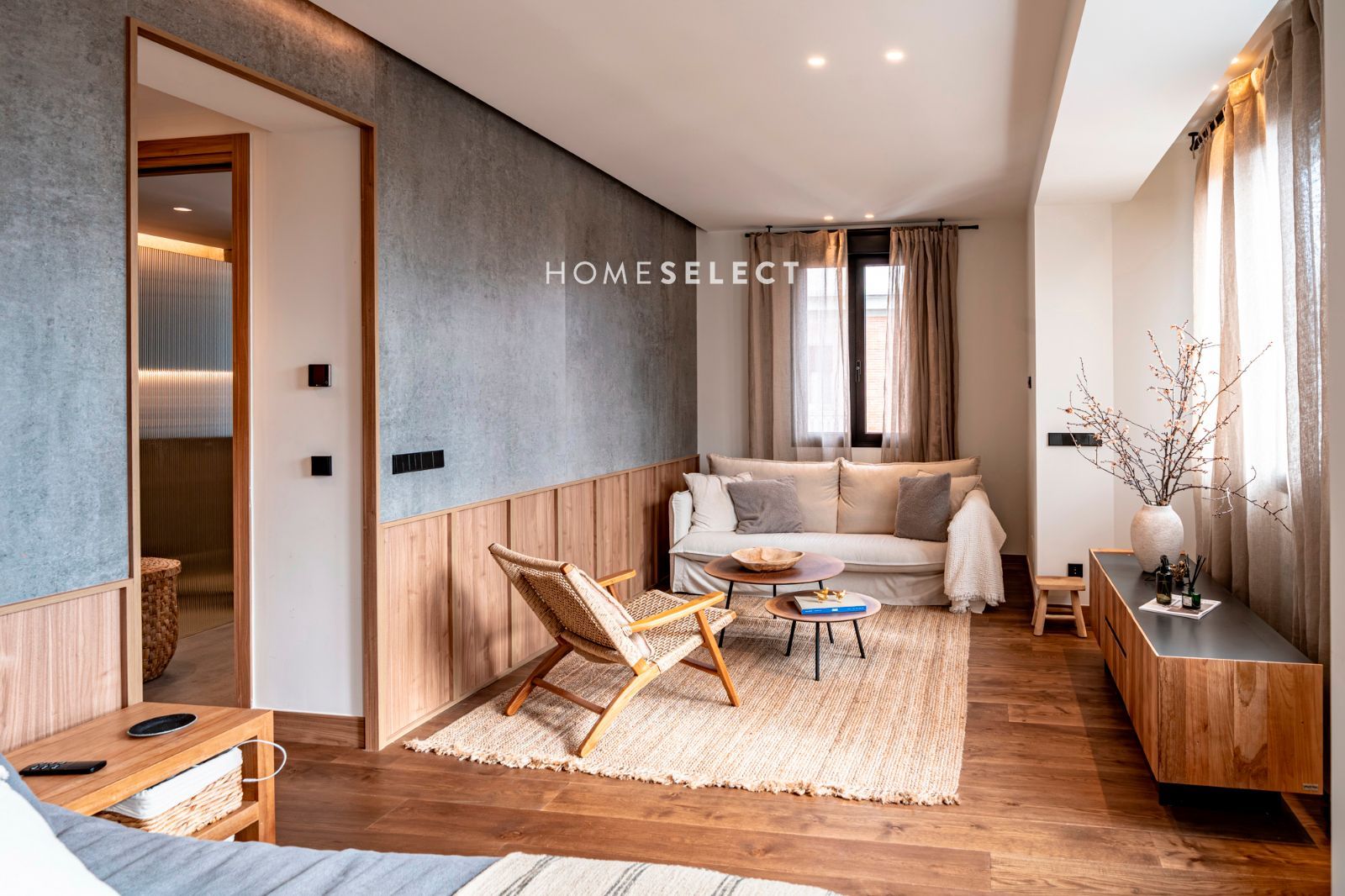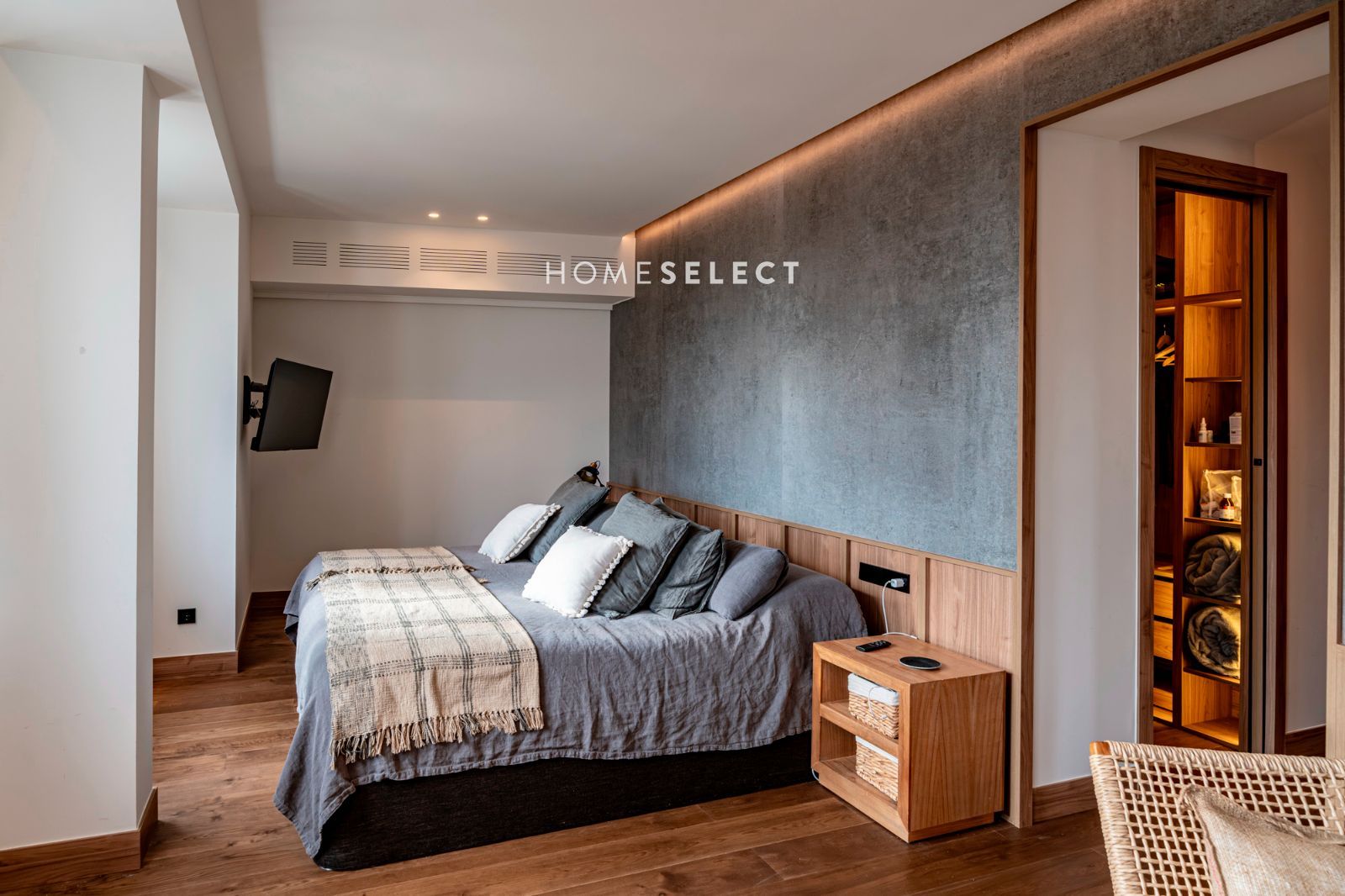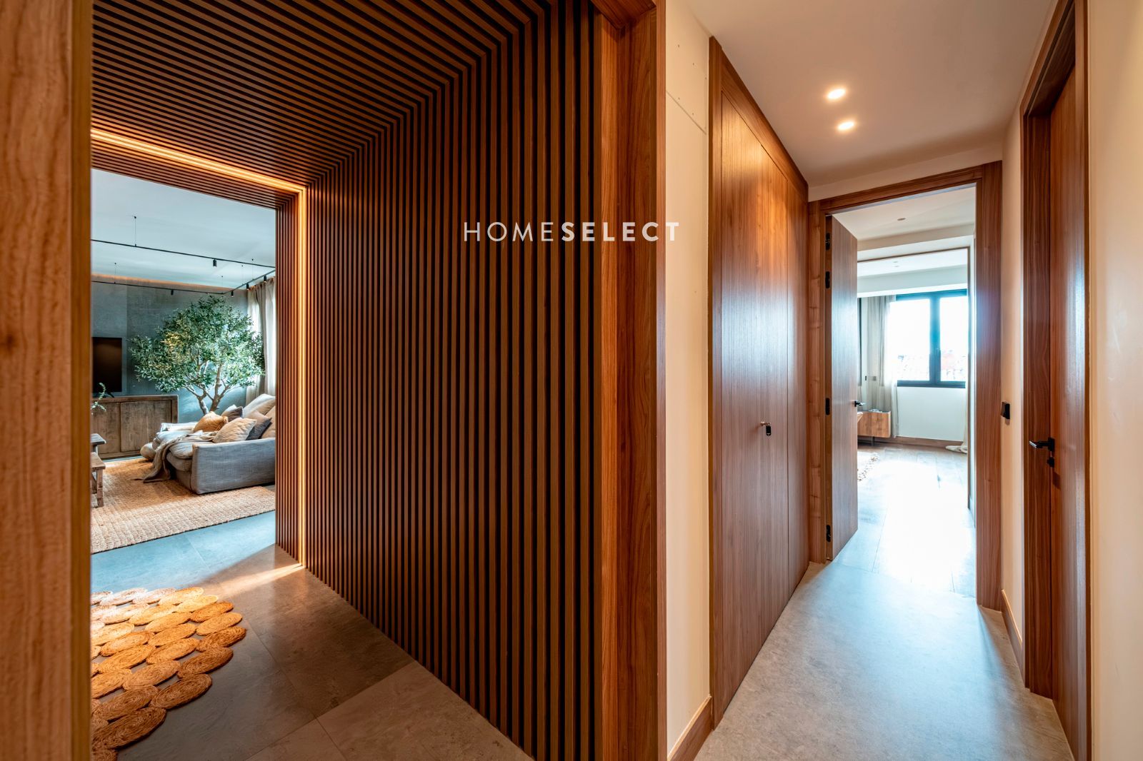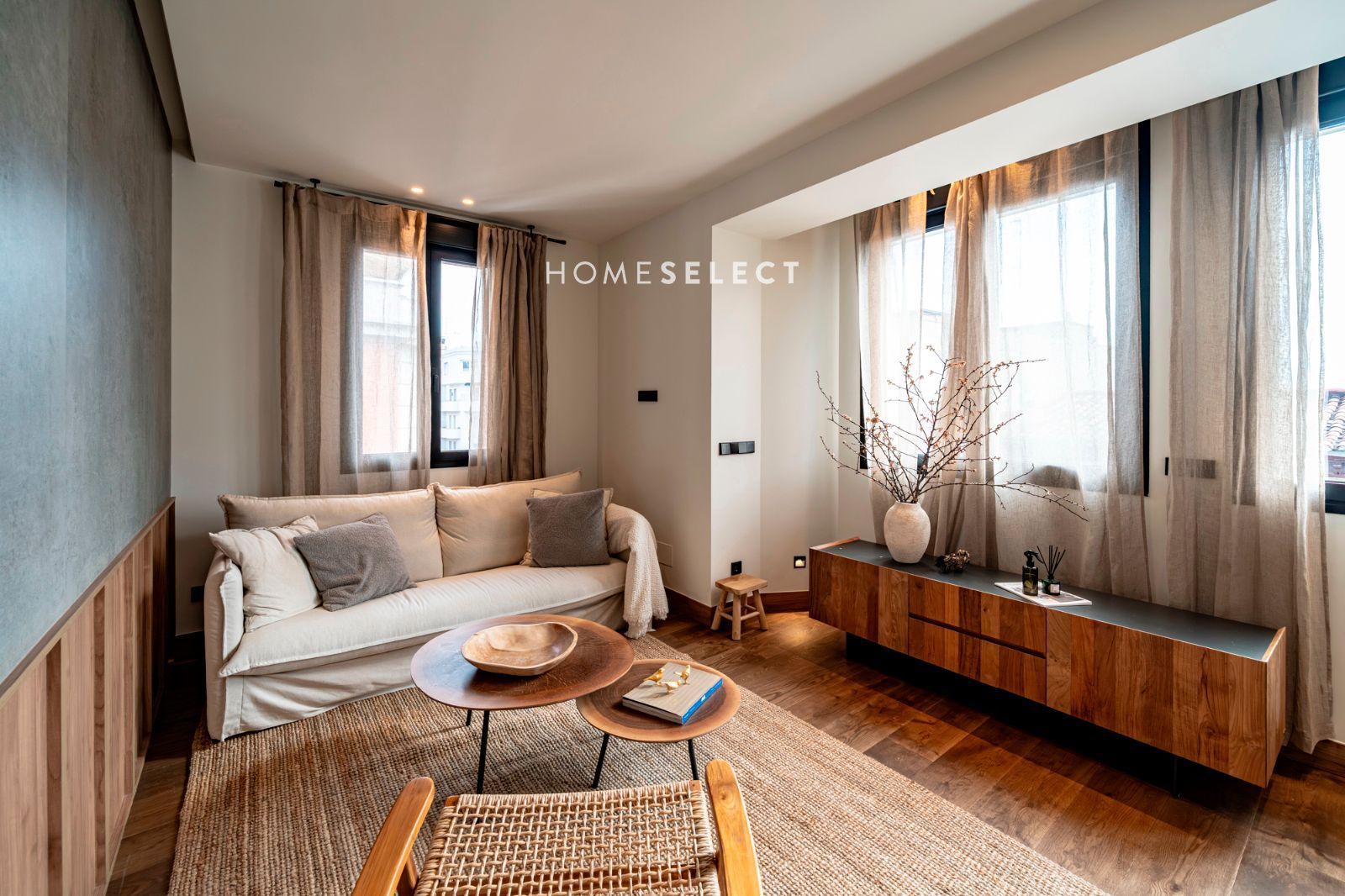 Ubicado en una quinta planta, este luminoso piso destaca por su amplitud, así como por su interiorismo singular, elegante y de gran calidad estética, que aporta carácter y sofisticación a cada estancia.  La vivienda cuenta con un gran salón-comedor con acceso a una pequeña terraza, ideal para disfrutar de momentos de descanso o de las vistas a la ciudad, y una cocina tipo americana, moderna y perfectamente integrada al espacio social.