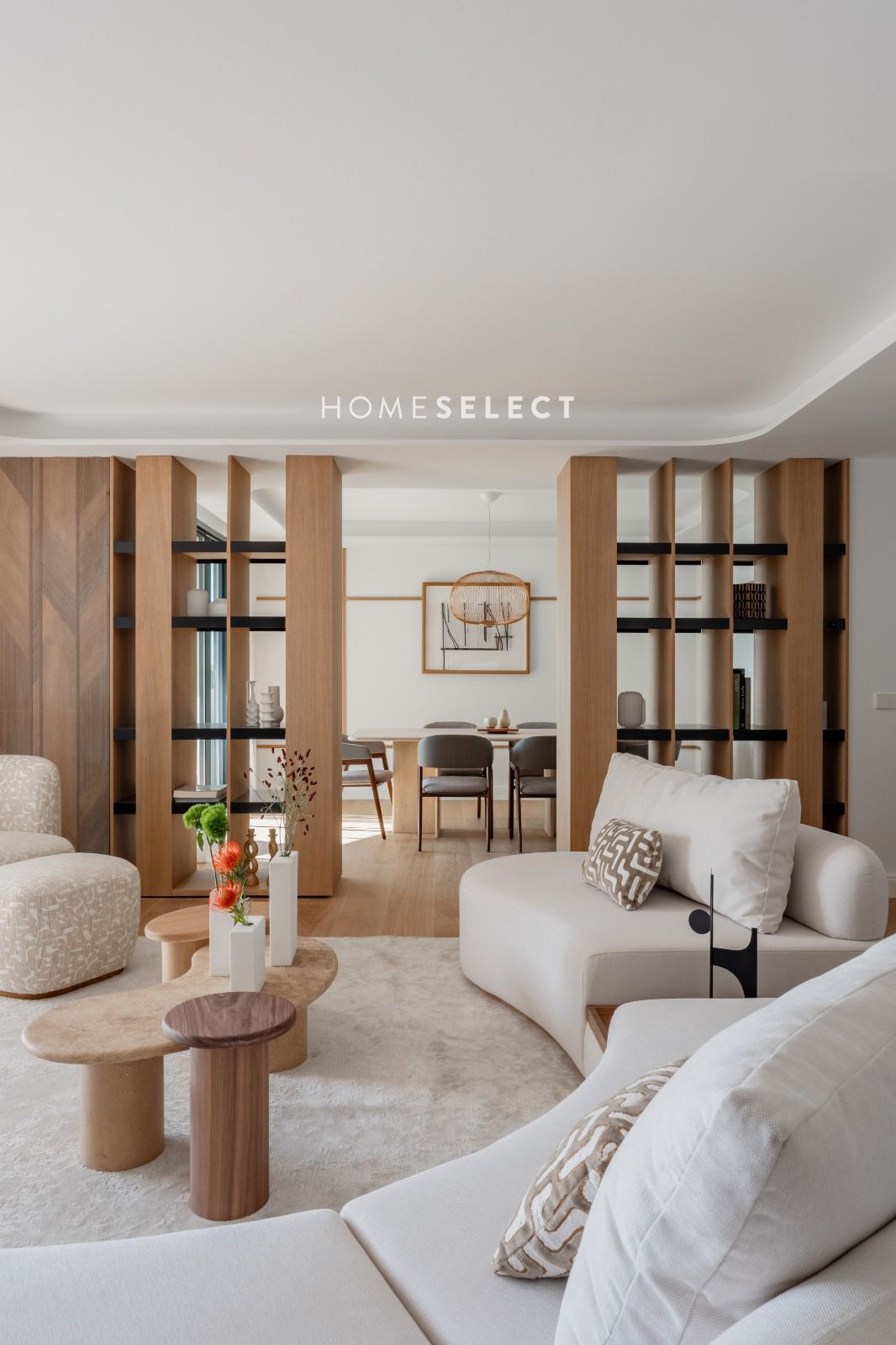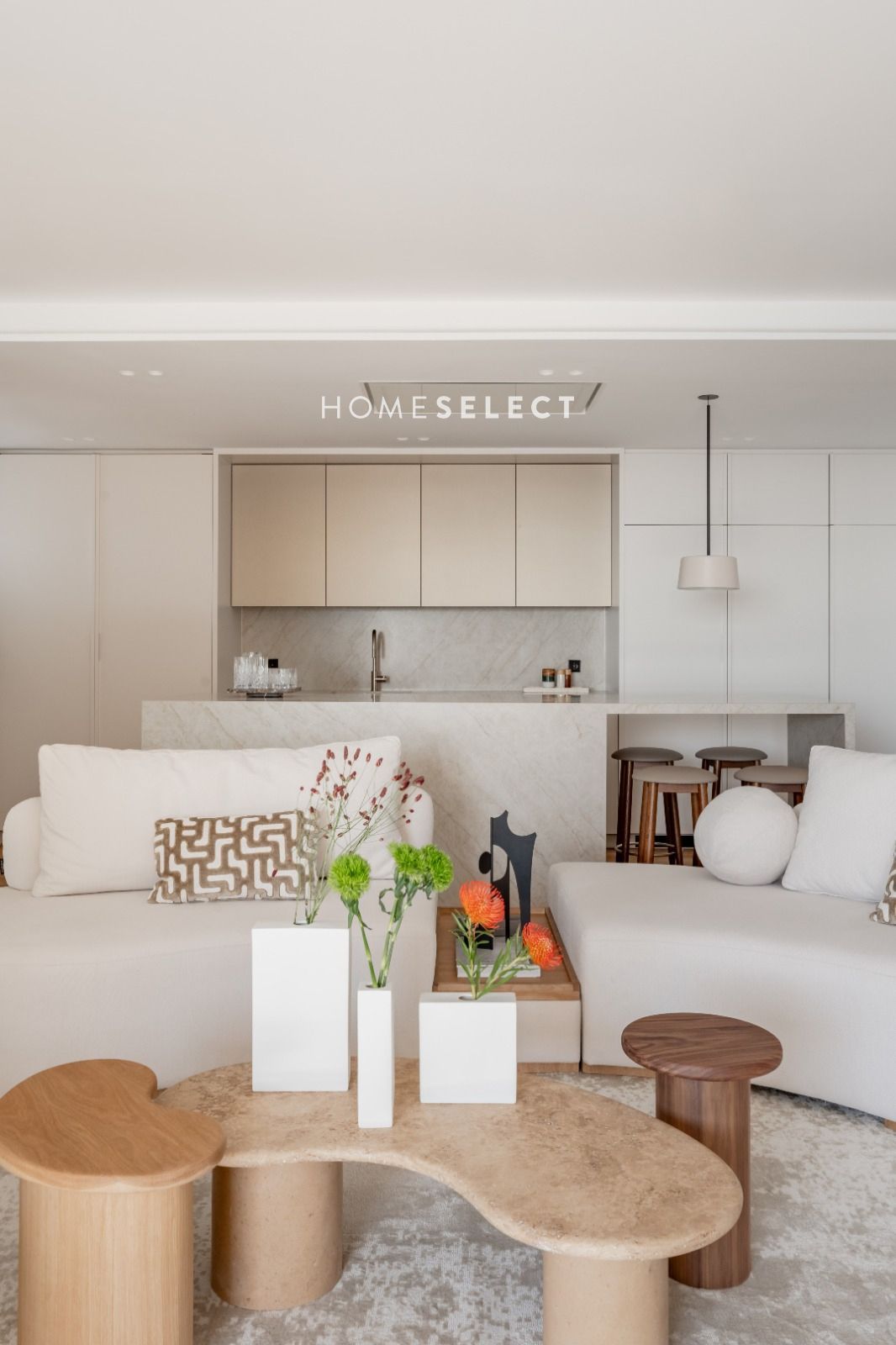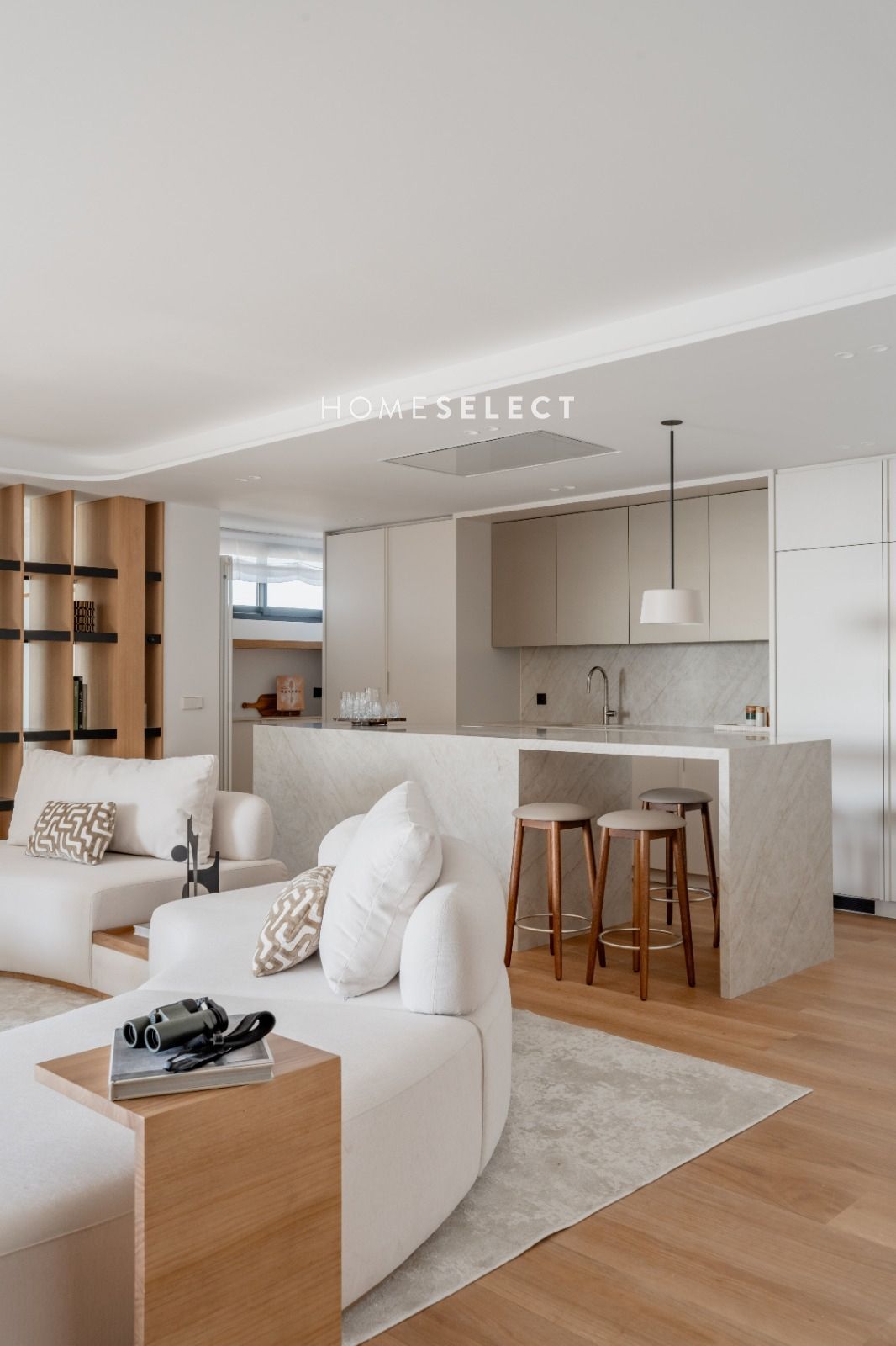 La zona de día se articula a partir de un hall de entrada que conduce en línea recta a un amplio salón, con salida directa a la terraza, la cual está planteada para albergar dos ambientes diferenciados. El salón se integra con una cocina abierta, equipada con una isla central que funciona como superficie de trabajo y también como comedor de diario para cuatro personas, con mucho espacio de almacenamiento.