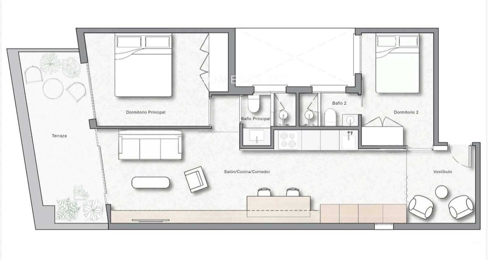 Se compone de 2 habitaciones y 2 baños completos. El dormitorio principal está configurado como una master suite con su propio baño en suite, mientras que el segundo baño da servicio al resto de la vivienda.