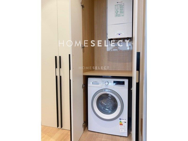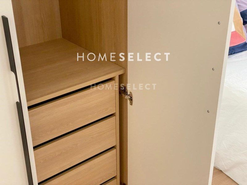 La distribución es la siguiente: nada más entrar en la vivienda, accedemos a un único espacio de área social, exterior, que comprende salón, comedor y cocina integrada con península, en tonos grises y equipada con todos los electrodomésticos. La zona de noche está compuesta por un primer dormitorio exterior con baño en suite, y un segundo dormitorio con baño fuera, que a su vez, funciona como baño de invitados. Adicionalmente, tiene un dormitorio pequeño que puede ser destinado a despacho, vestidor, habitación de bebé, etc.
