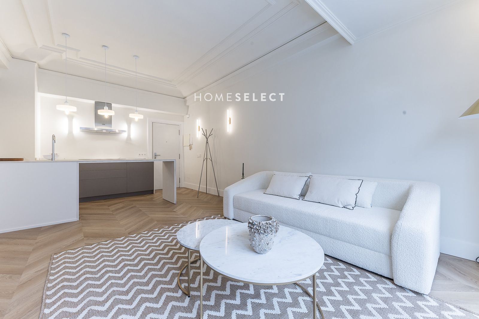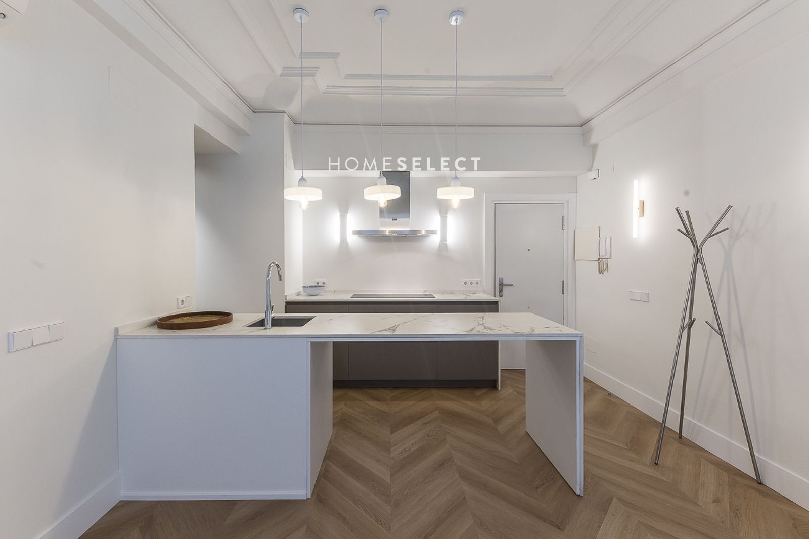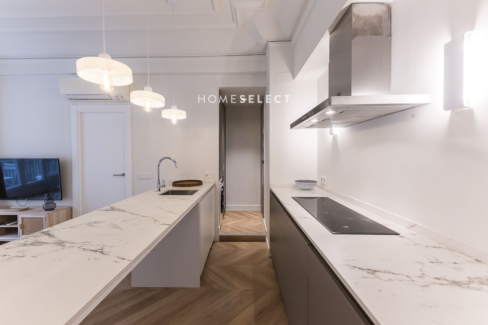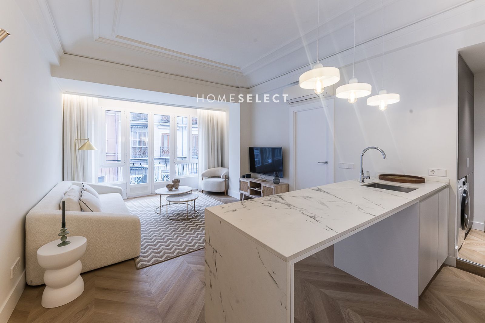 El piso ha sido recientemente reformado y se entrega a estrenar, completamente amueblado con un estilo actual y cuidado. Dispone de un amplio salón-comedor, con fantásticas alturas de techo y elegantes molduras, que realzan el carácter de la vivienda. La cocina de planta abierta, integrada en el salón, está totalmente equipada con electrodomésticos y cuenta con salida directa a la terraza.