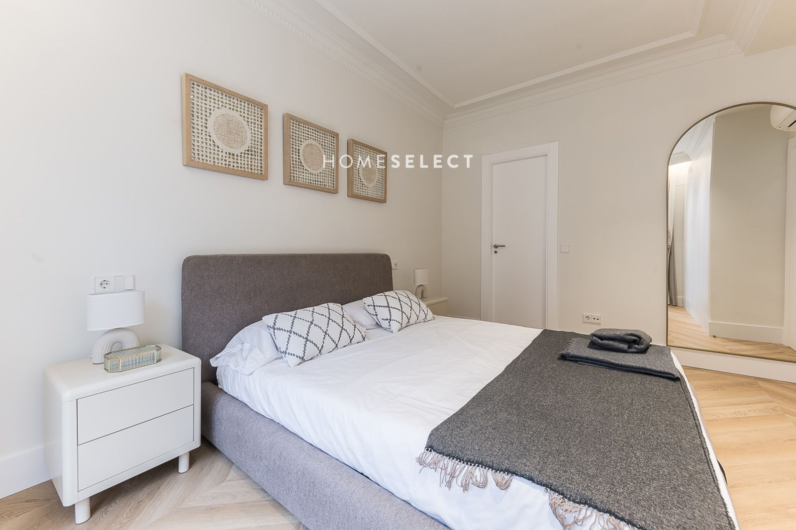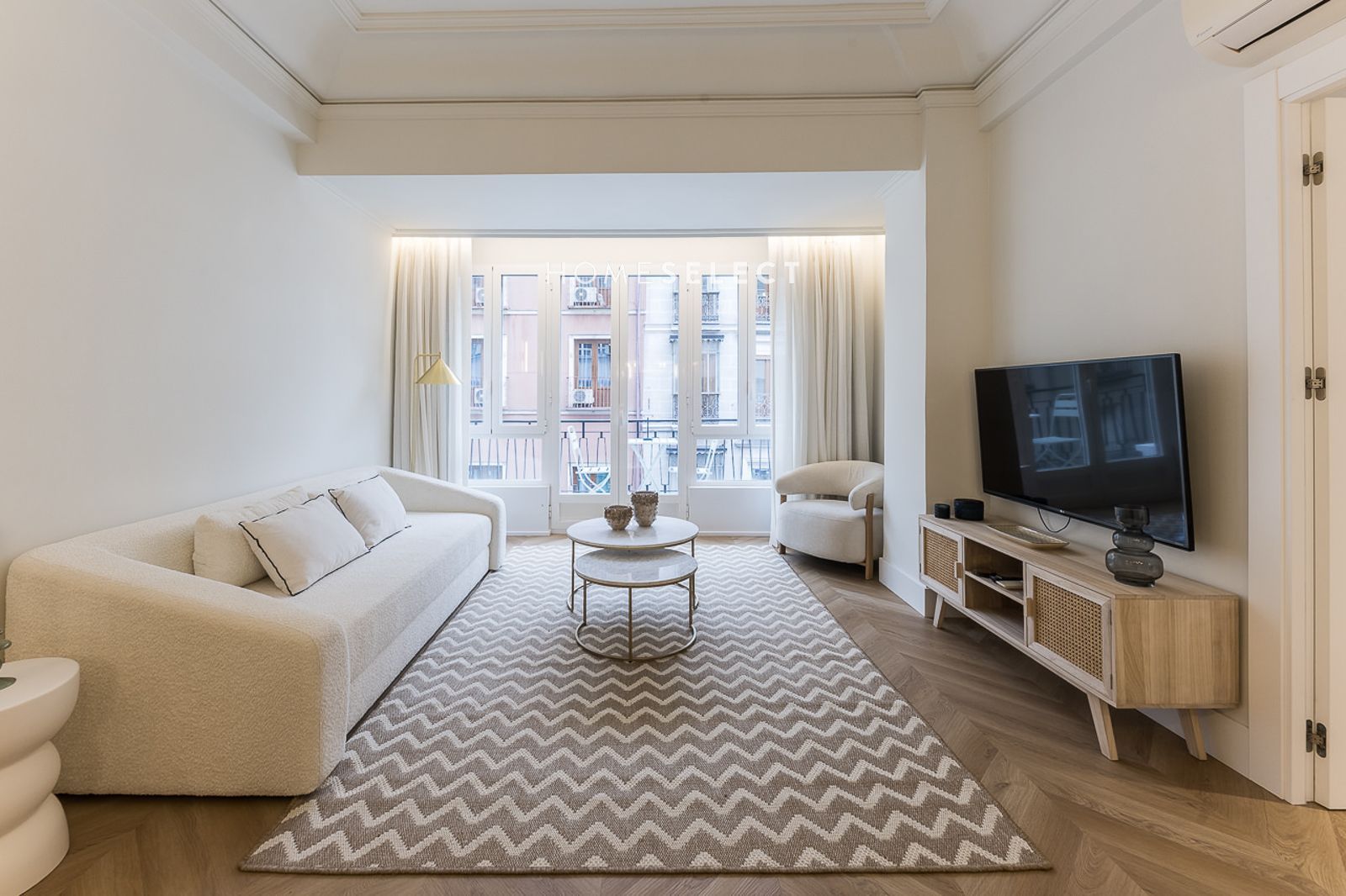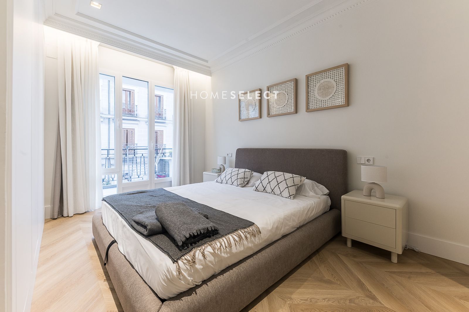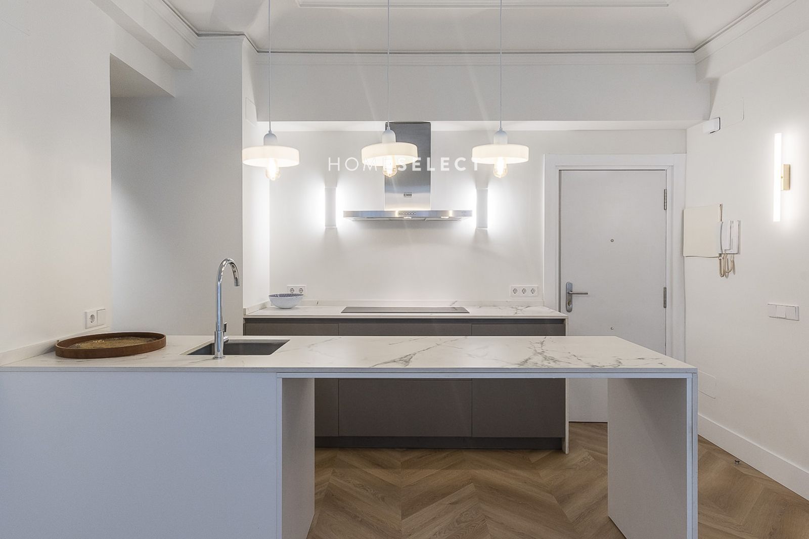 El piso ha sido recientemente reformado y se entrega a estrenar, completamente amueblado con un estilo actual y cuidado. Dispone de un amplio salón-comedor, con fantásticas alturas de techo y elegantes molduras, que realzan el carácter de la vivienda. La cocina de planta abierta, integrada en el salón, está totalmente equipada con electrodomésticos y cuenta con salida directa a la terraza.