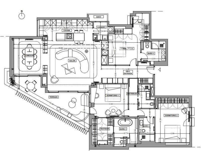 La zona de día se articula a partir de un hall de entrada que conduce en línea recta a un amplio salón, con salida directa a la terraza, la cual está planteada para albergar dos ambientes diferenciados. El salón se integra con una cocina abierta, equipada con una isla central que funciona como superficie de trabajo y también como comedor de diario para cuatro personas, con mucho espacio de almacenamiento.