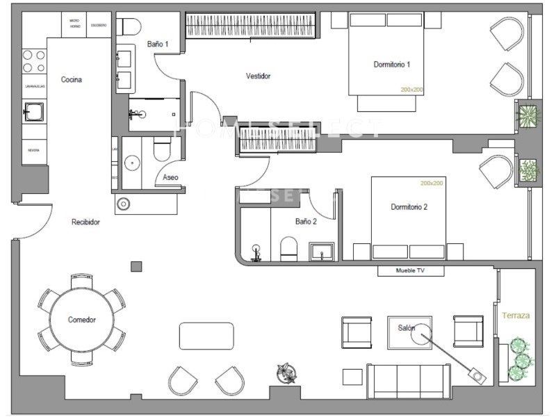 Se distribuye de la siguiente manera: la vivienda cuenta con un luminoso salón-comedor y una cocina independiente equipada con materiales de alta calidad. Dispone de dos amplios dormitorios con armarios empotrados y dos baños completos, además de un aseo de cortesía que aporta un extra de funcionalidad. El inmueble está equipado con aire acondicionado y calefacción individual.
