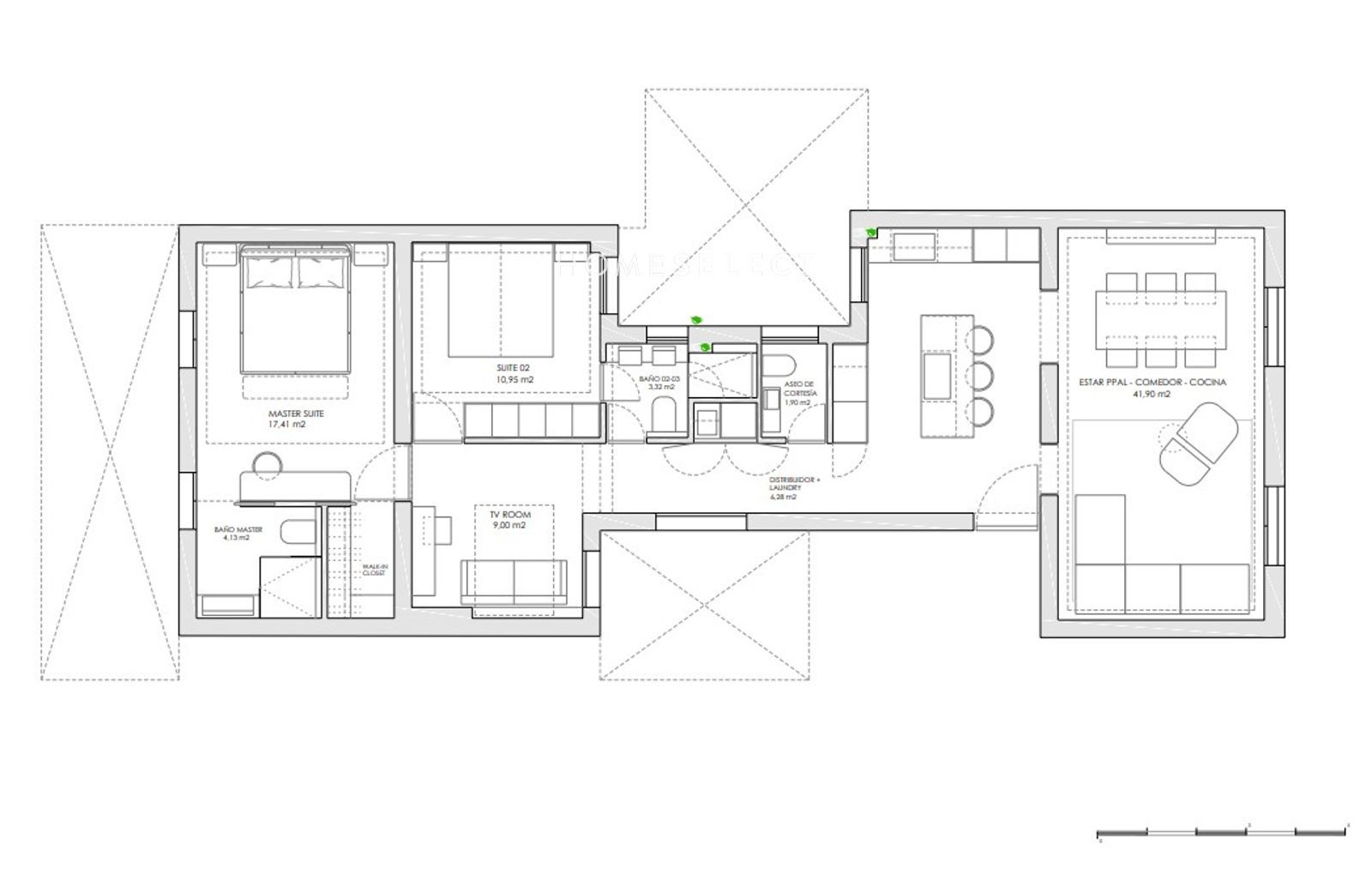 La reforma, recién terminada, cuenta con la siguiente distribución: un elegante salón-comedor con cocina abierta, dos dormitorios en suite, un aseo de cortesía, un espacio versátil de family room o tercer dormitorio, y una zona de lavandería independiente.