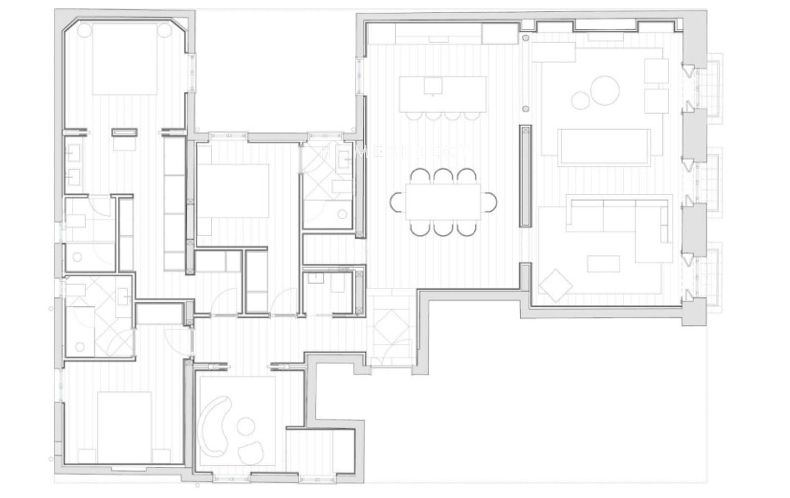 Esta propiedad de 225 m² destaca por su excepcional luminosidad y por haber sido objeto de una reforma integral a estrenar. La vivienda cuenta con tres balcones a la calle, integrados en un edificio de fachada clásica totalmente rehabilitado que ofrece servicios exclusivos de lujo, como spa y gimnasio.