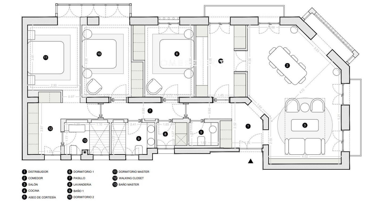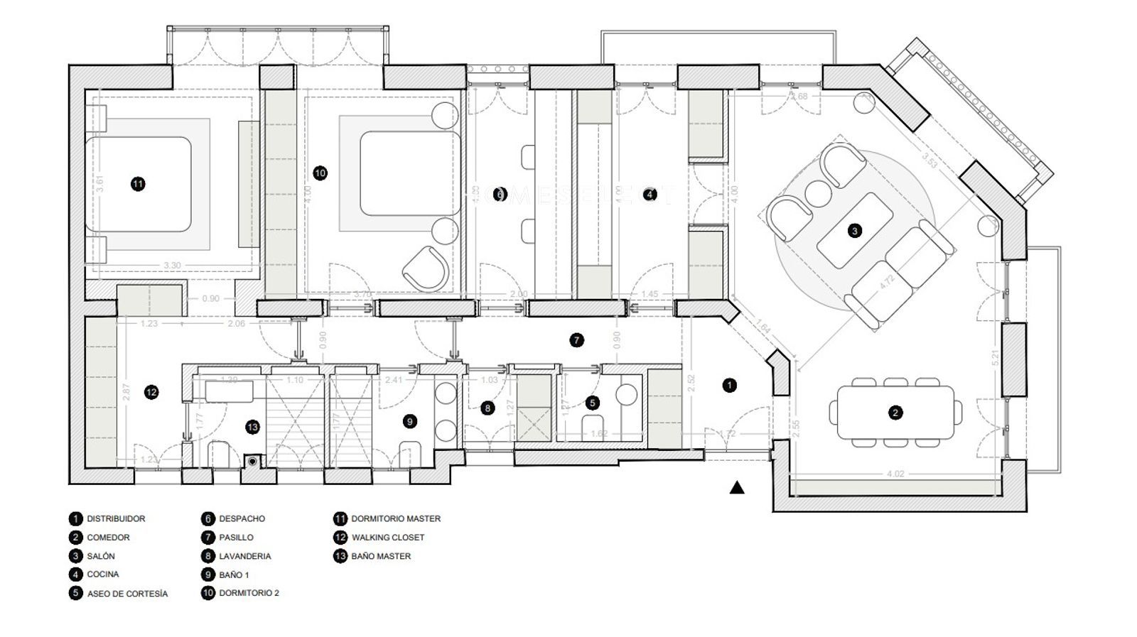 -Reforma con 2 dormitorios y 3 baños: Distribución optimizada con zona de día amplia (salón + comedor) y cocina independiente con lavandería, incorporando aseo de cortesía y un despacho. La zona de noche se compone de 2 dormitorios, con suite principal que integra walking closet y baño master, además de baño 1 para el resto de la vivienda. Circulaciones claras y programa completo, priorizando funcionalidad y confort.