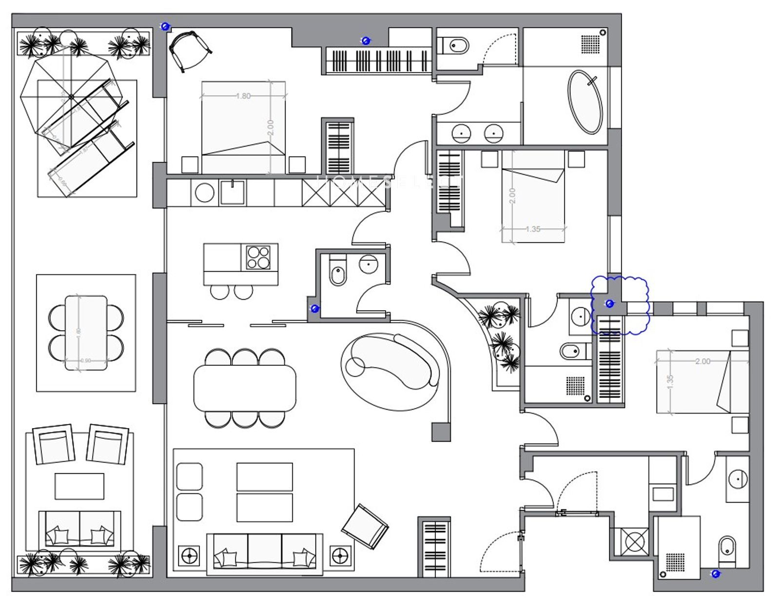 La distribución es la siguiente: nada más entrar en la vivienda el hall nos conduce hacia un amplio salón-comedor que se comunica con una cocina independiente, exterior, ambos espacios con salida directa a la terraza, creando una conexión fluida entre interior y exterior. La terraza, especialmente amplia, permite organizar diferentes ambientes: zona de comedor al aire libre, área de descanso y espacios pensados para disfrutar durante todo el año.