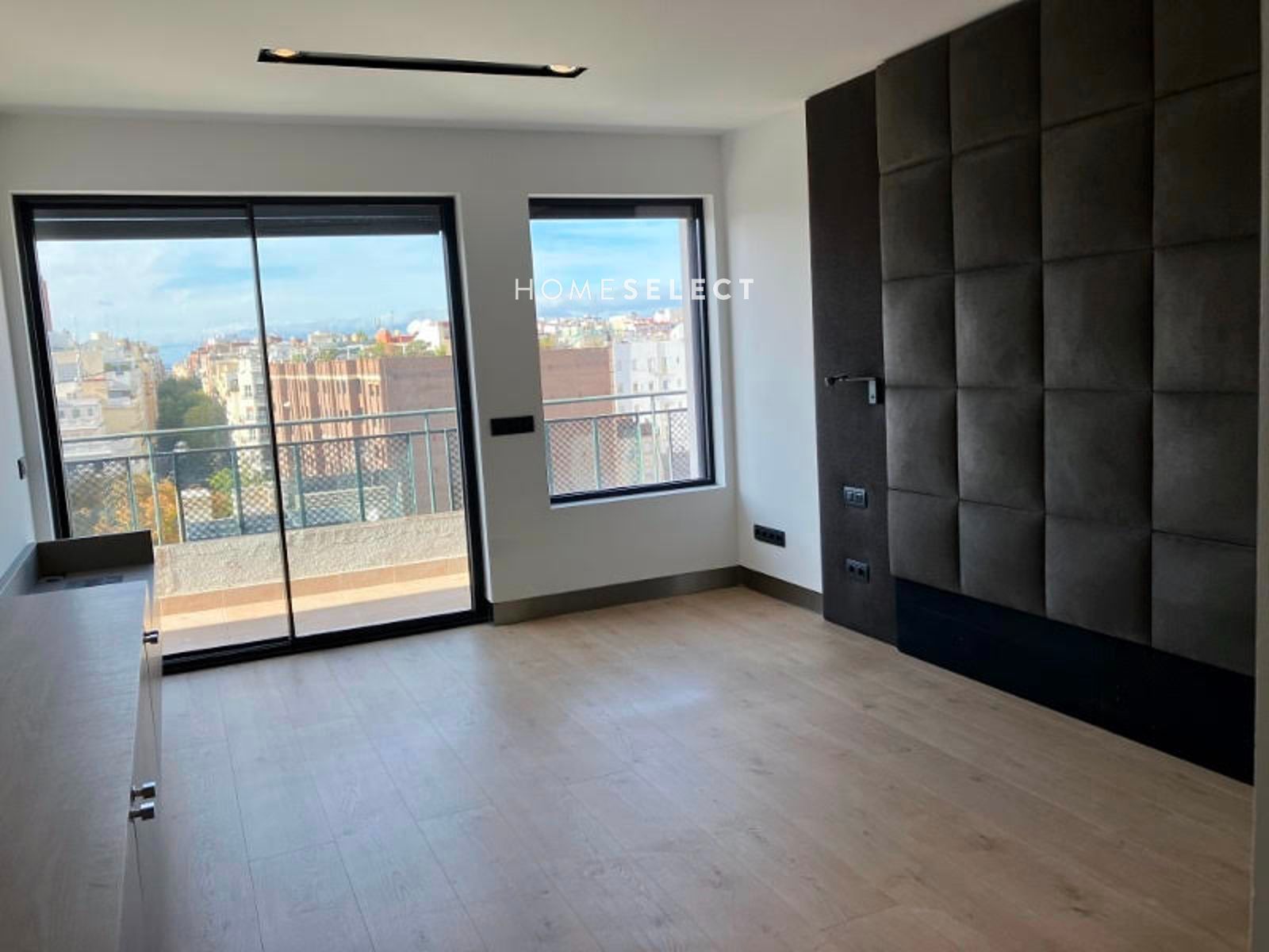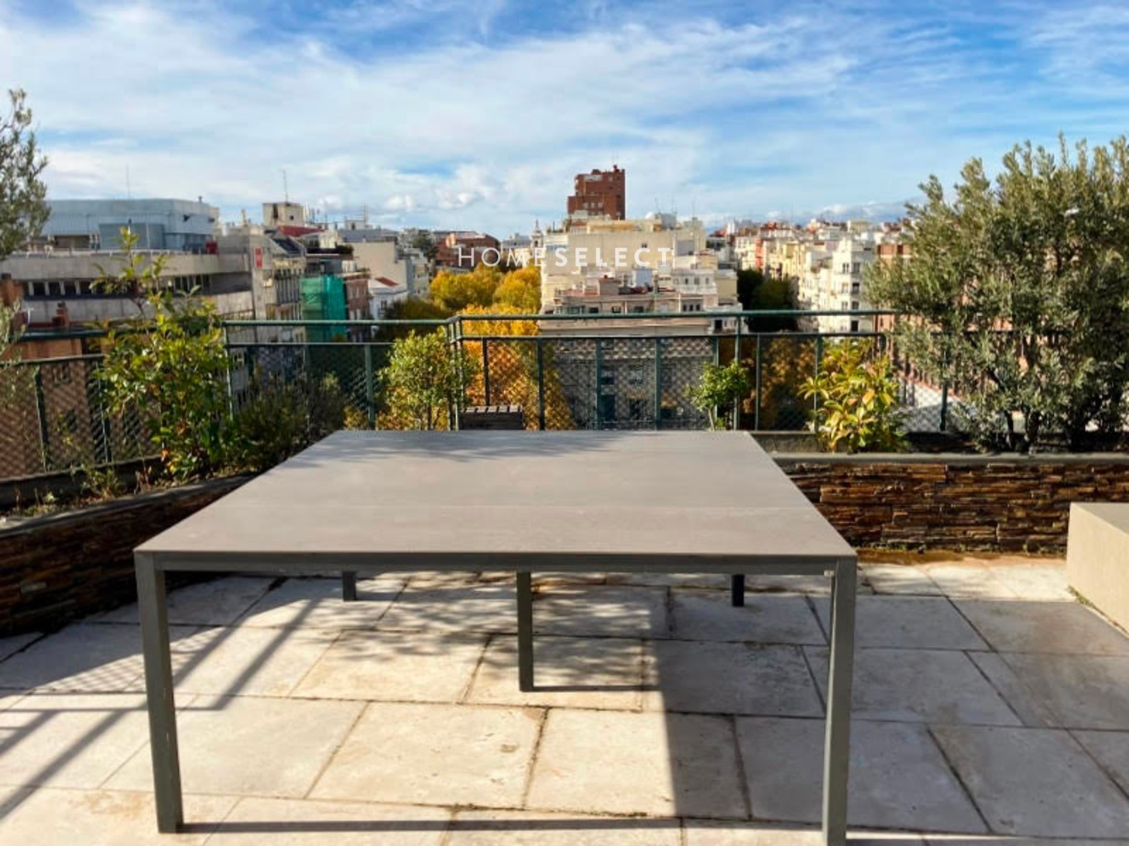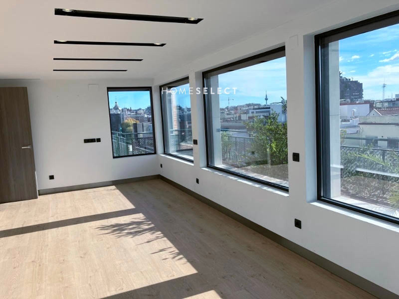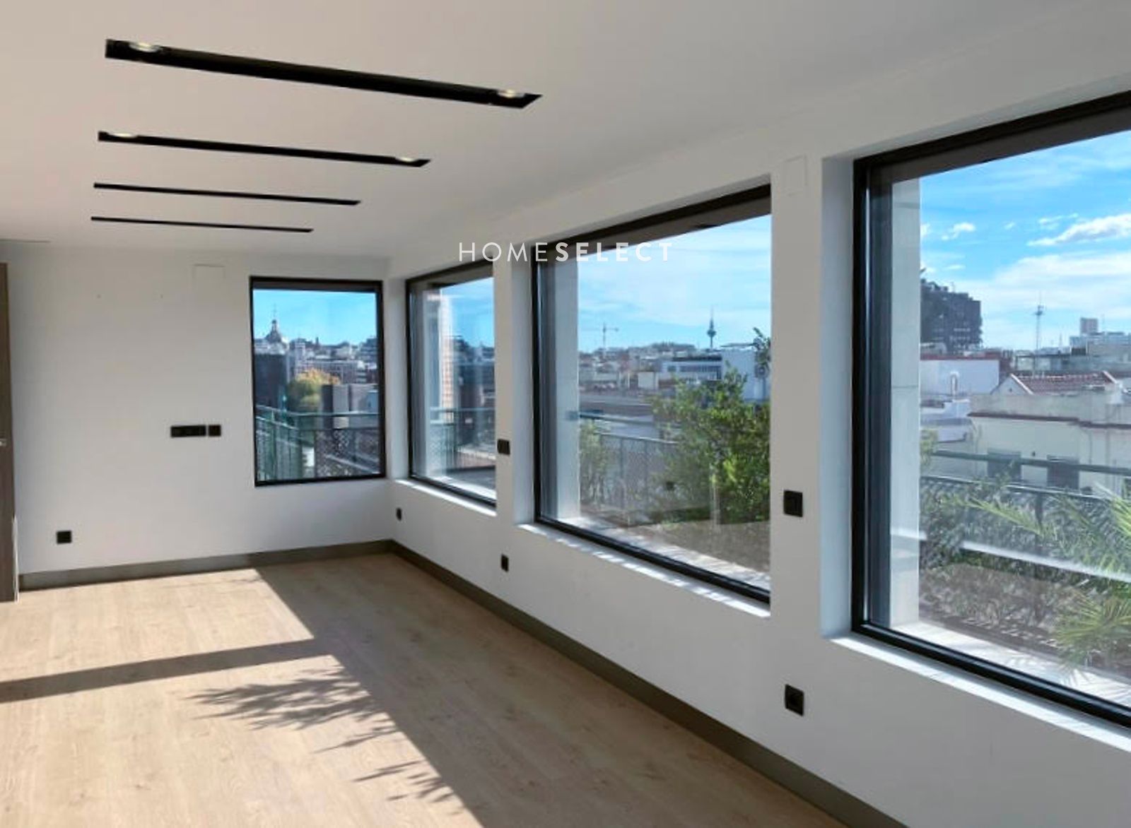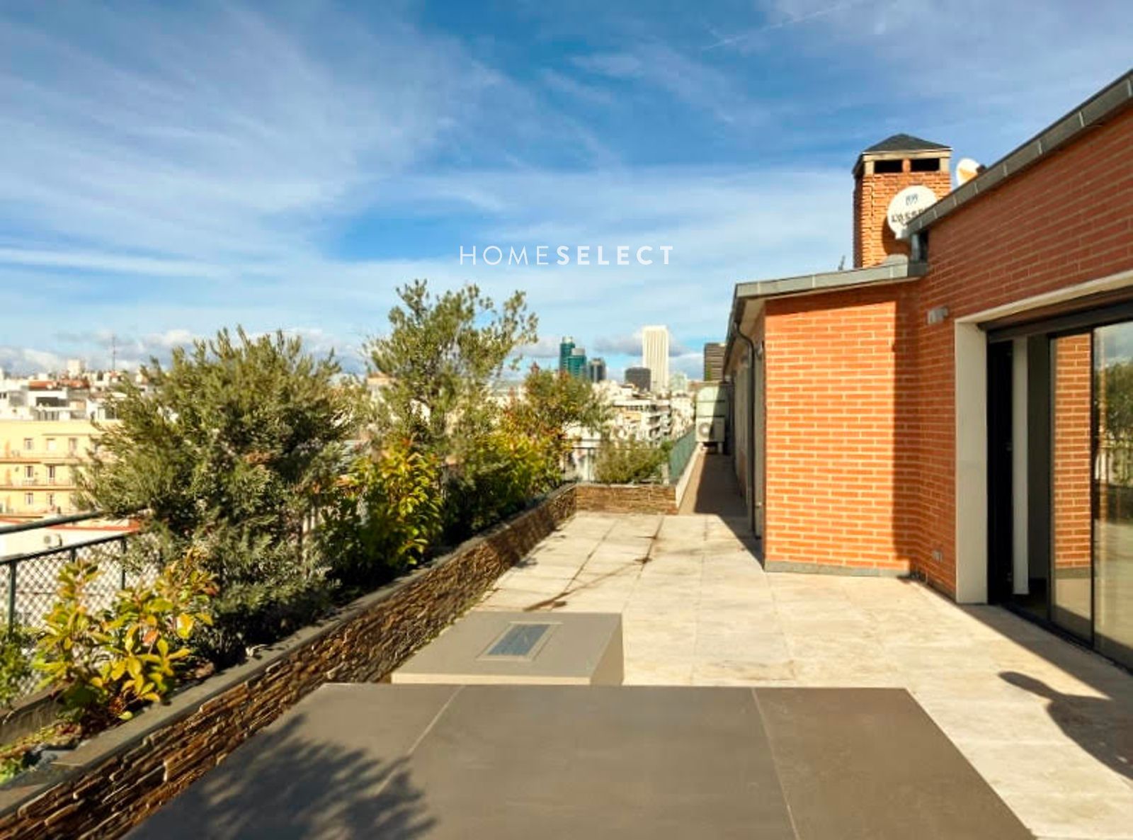 Home Select vende ático exclusivo en novena planta, completamente exterior, ubicado en Barrio de Chamberí - Almagro, en una de las zonas más representativas y elegantes de Madrid. La vivienda hace chaflán, lo que le proporciona una luminosidad excepcional y vistas despejadas desde prácticamente todas las estancias.