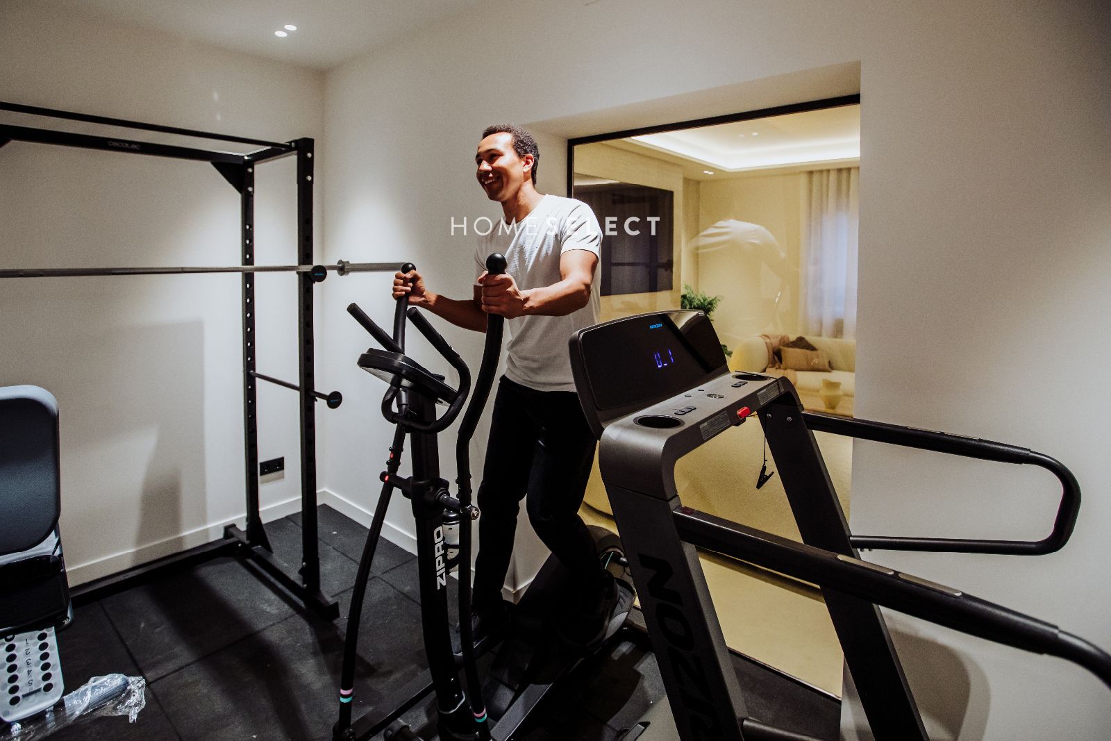 El gimnasio privado está completamente equipado como un auténtico espacio de entrenamiento, con un minibox que incluye remo de ERG, rack para barras de Cecotec, kettlebells y mancuernas de distintos pesos, banco de pesas, así como una zona destinada a yoga, pilates y estiramientos. Además, dispone de sistema de altavoces bluetooth para una experiencia completa.