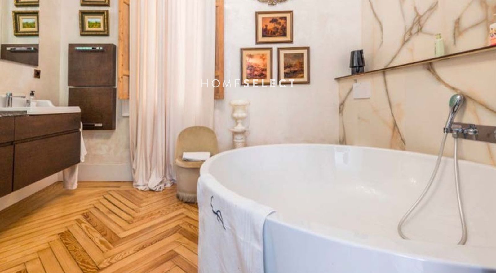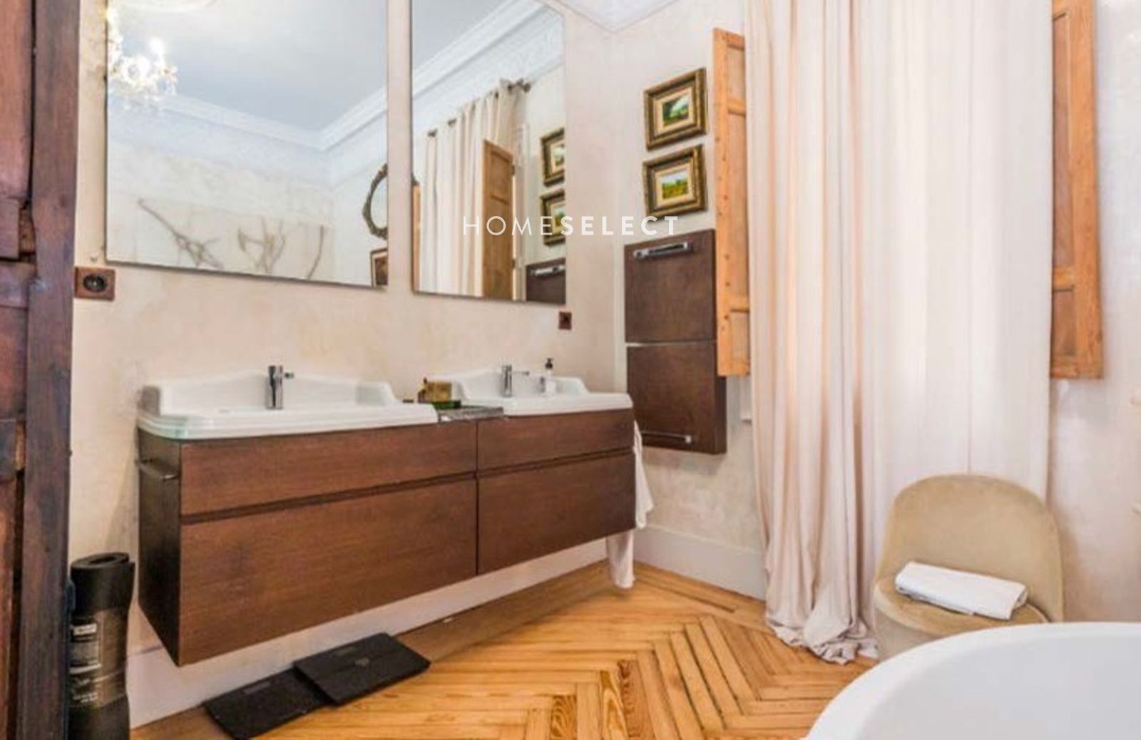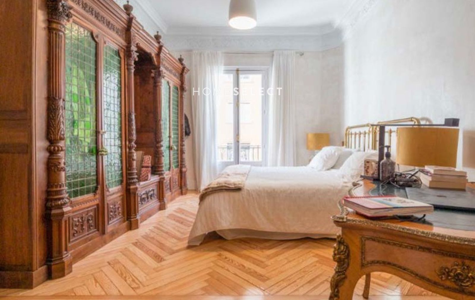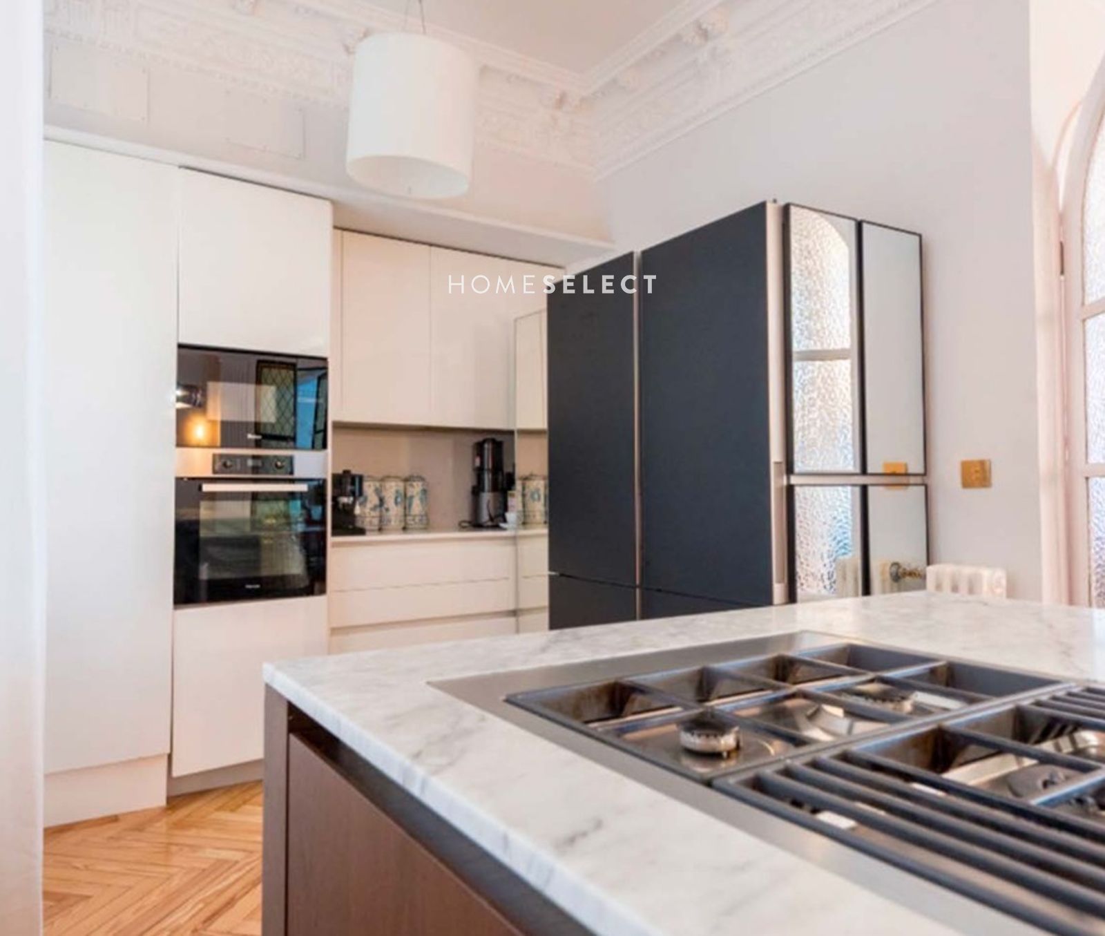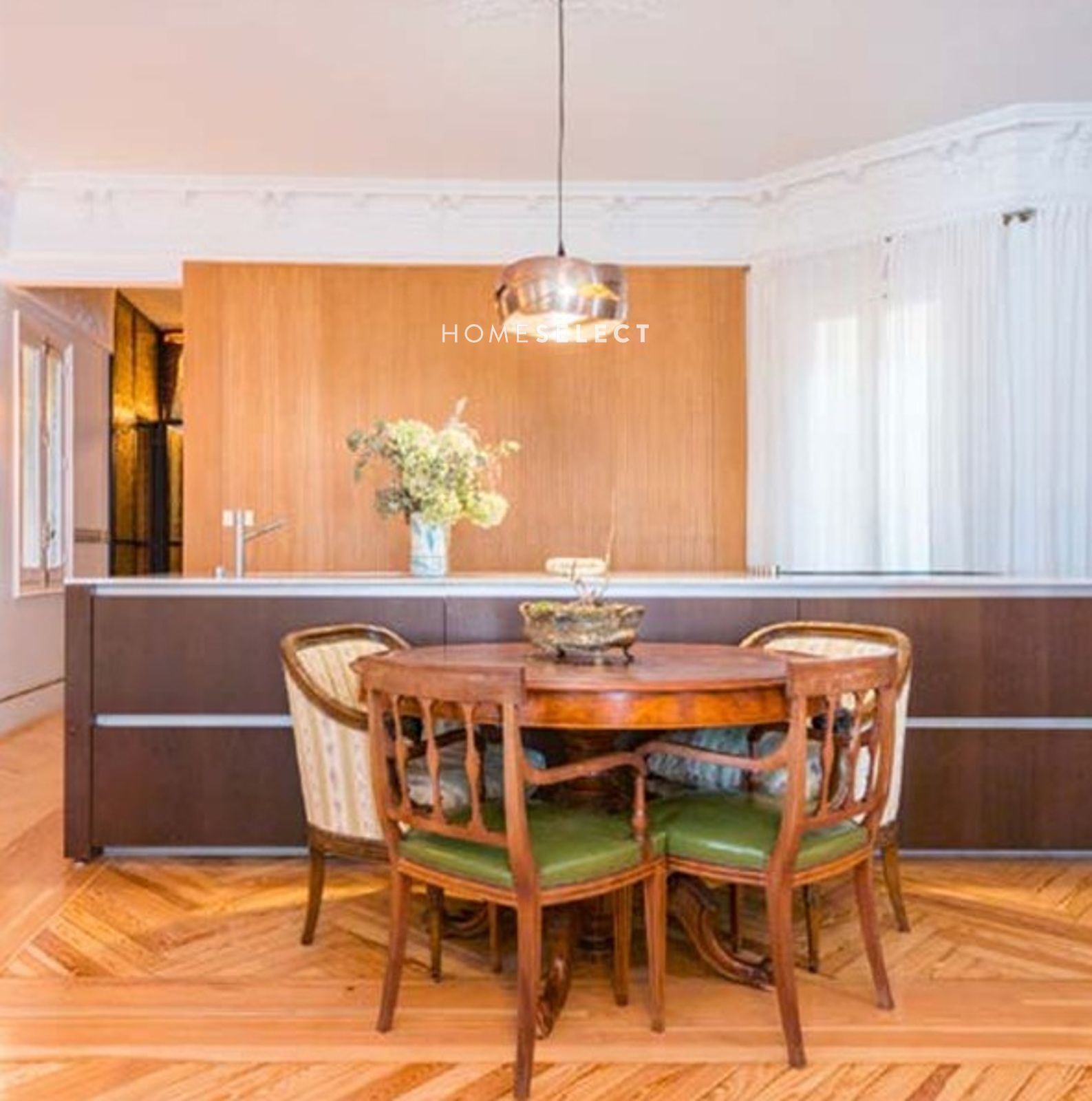Este piso sorprende por su armónico equilibrio entre los elementos originales decorativos y los toques de modernidad contemporánea con materiales de altísima calidad. Las molduras hechas a medidas, los tiradores restaurados y las vidrieras emplomadas de la época. Destacan los suelos de pino melis de 1900.