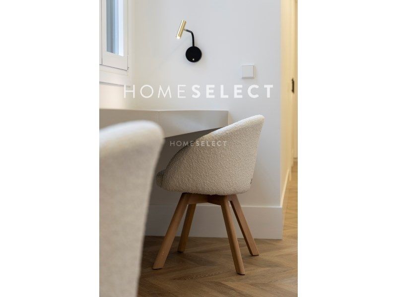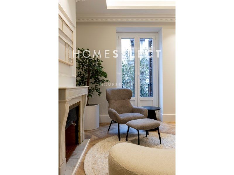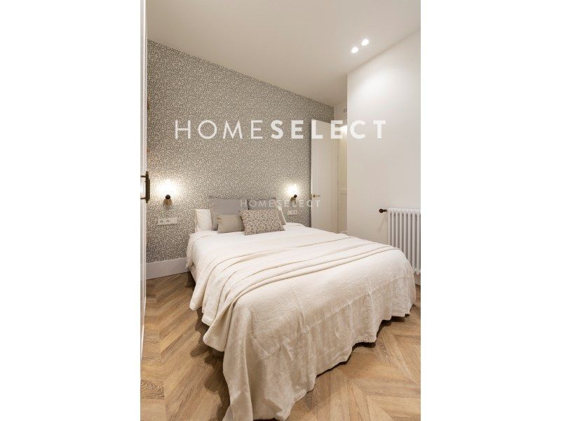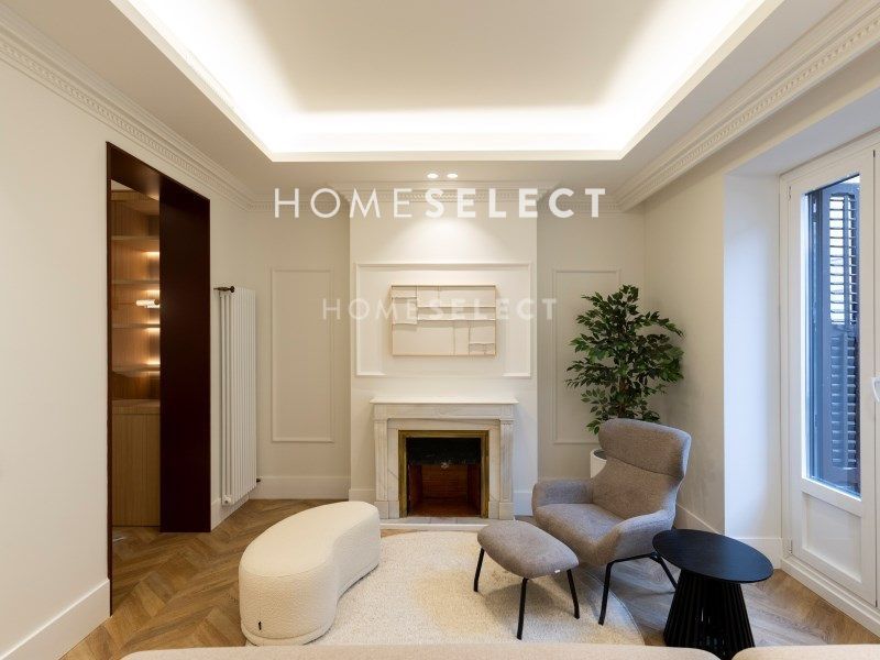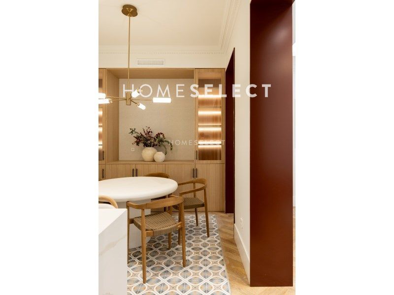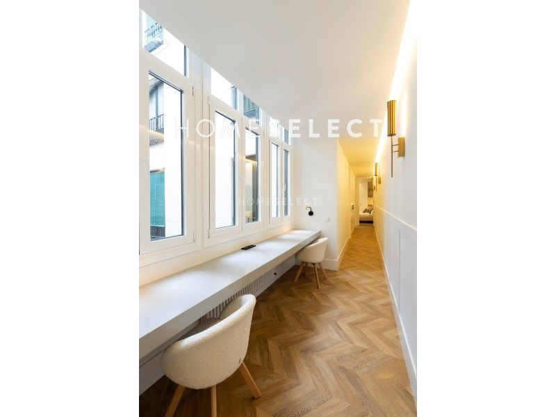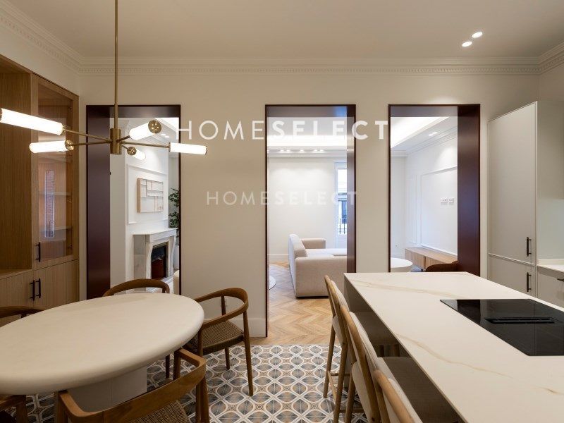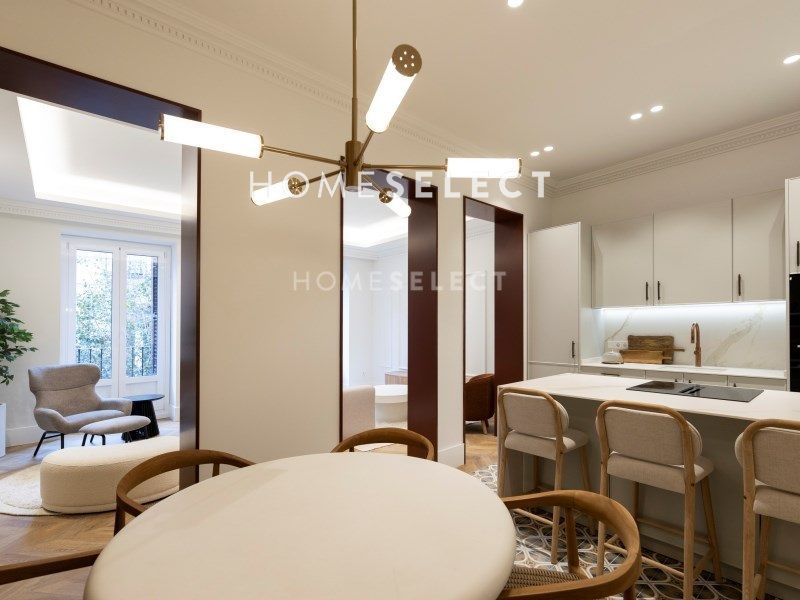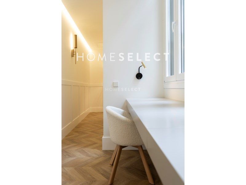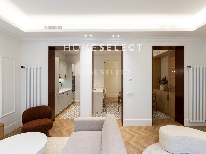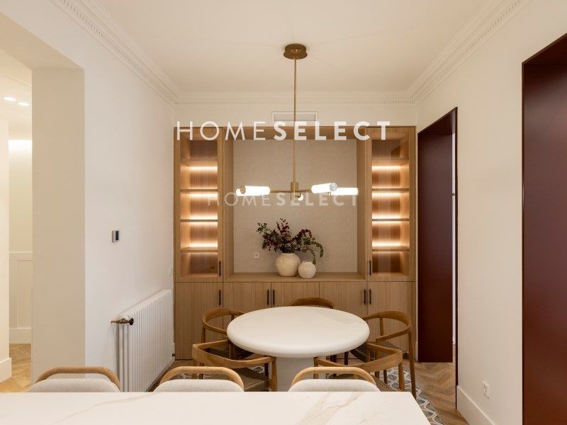 La vivienda ha sido objeto de una profunda reforma conservando su encanto original en sus techo de 3,15 metros, sus zócalos y molduras de escayola, su suelo en madera de roble en espiga y sus balcones en hierro forjado. Además, la vivienda se ha dotado de las mejores calidades como aire acondicionado regulable por zonas, calefacción individual por gas natural con radiadores de diseño, electrodomésticos Bosch, grifería en color cobre envejecido, suelo hidraúlico en la zona de comedor y cocina, mamparas de ducha hasta el techo, puertas plafonadas y lacadas de gran formato,...