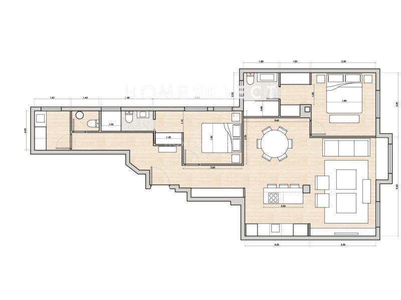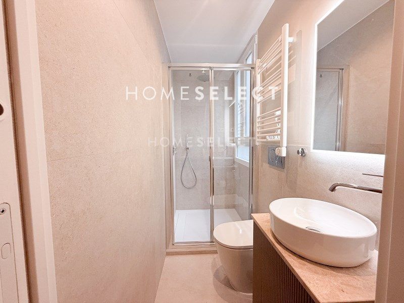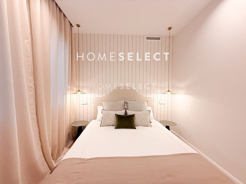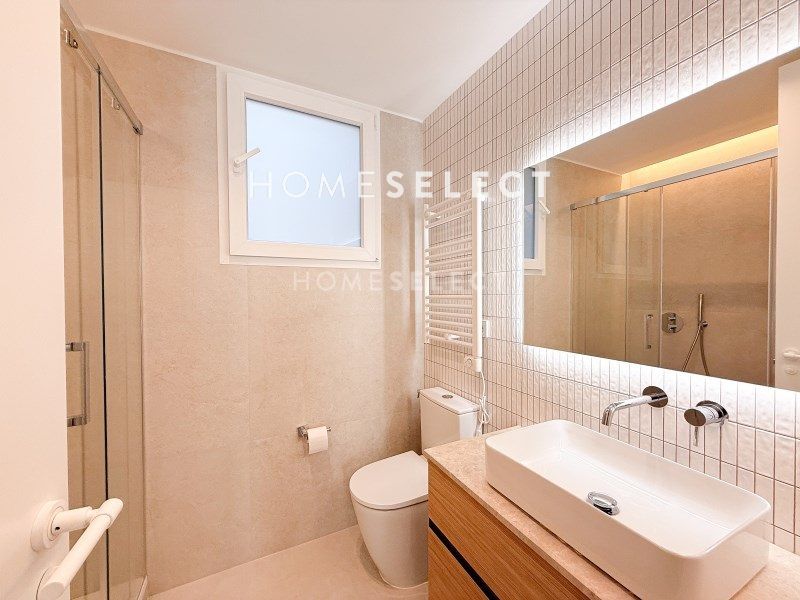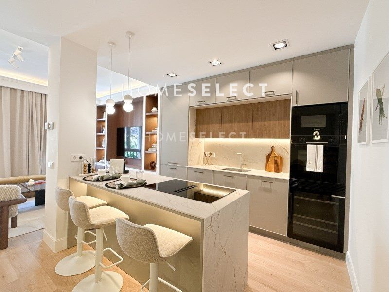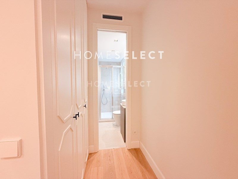 Una moderna y acogedora cocina de diseño equipada con muebles hechos a medida, con puertas de madera plafonadas, encimera de porcelánico y todos los electrodomésticos de primera marca incluidos. Rodapiés de madera lacados en color blanco. Amplios armarios empotrados en todas las habitaciones con puertas lacadas en tonos claros e interiores en madera laminada con textura lino. Todas las puertas de la vivienda son lacadas en tonos claros, llevan cerraduras imantadas y bisagras ocultas. Baños revestidos con porcelánicos de primera calidad y equipados con mueble de lavabo hecho a medida y encimeras de piedra natural, platos de ducha en resina con mampara, artefactos, grifería, radiador toallero y accesorios.