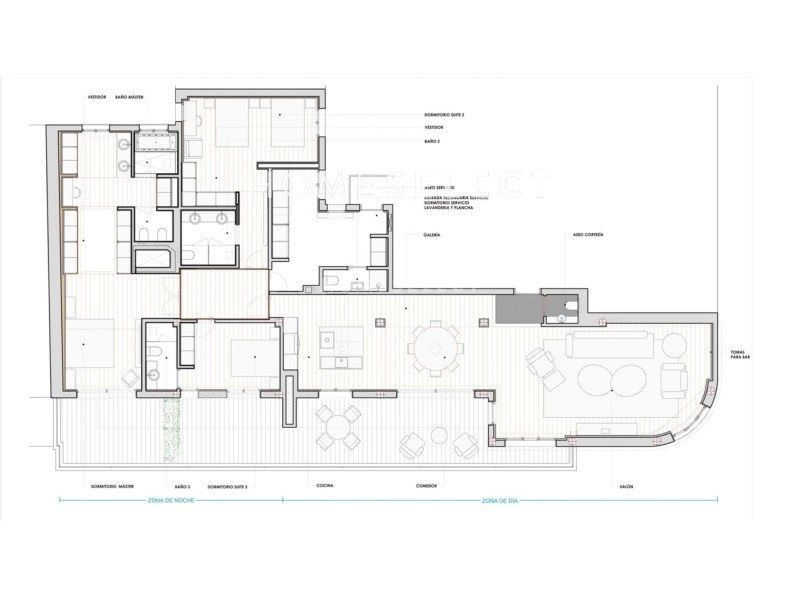 Zona de noche: la zona de dormir está compuesta por tres dormitorios de buen tamaño, con sus tres cuartos de baño en suite. Dos de los dormitorios tienen salida directa a la terraza. El dormitorio principal, muy luminoso, cuenta además con un gran walk-in closet, zona de tocador o escritorio y bañera exenta.
