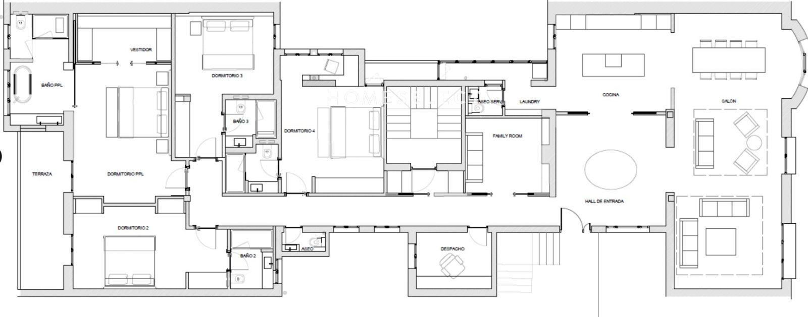 En la zona de día: según entramos en la vivienda nos recibe un impresionante hall de entrada que nos conduce, por una lado a la zona de descanso en dos ambientes con dos grandes ventanales a la calle, y por otro lado a la cocina independiente, equipada con electrodomésticos y una isla central que comunica con un comedor para 10 comensales repleto de luz natural que entra por un gran ventanal con forma curvada. Aseo de cortesía y al lado de la cocina área de laundry.