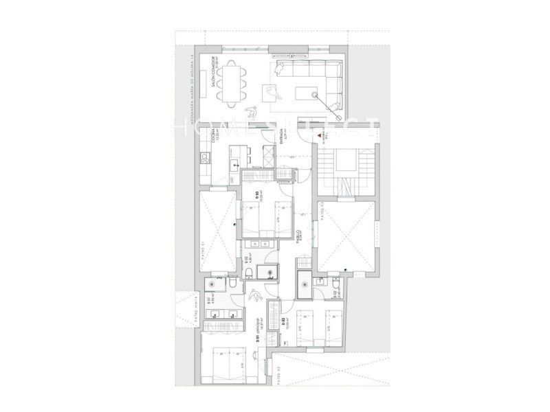 La vivienda cuenta con una superficie de 135 m² y ha sido reformada a estrenar. Dispone de salón-comedor con acceso directo a los balcones, cocina independiente con isla central, y un total de tres dormitorios y tres baños, dos de ellos en suite. La distribución permite independencia entre las zonas comunes y privadas, aprovechando también varios patios interiores que aportan luz natural a estancias interiores.