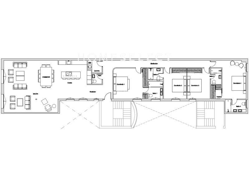 Se ubica en una tercera planta exterior dentro de un edificio de 1934. Se entrega completamente reformado y amueblado, aunque actualmente se encuentra en proceso de transformación. Tiene una superficie construída de 243m2 y la distribución prevista contempla una gran zona social exterior con dos balcones a la calle, compuesta por una zona de descanso en dos ambientes abierta a un comedor y una cocina integrada, con isla central y equipada con todos los electrodomésticos. Tiene un aseo de cortesia y una zona de lavandería. La zona de noche está compuesta por cuatro dormitorios con baños en suite. Todas las habitaciones de gran tamaño, con camas dobles.