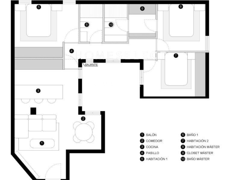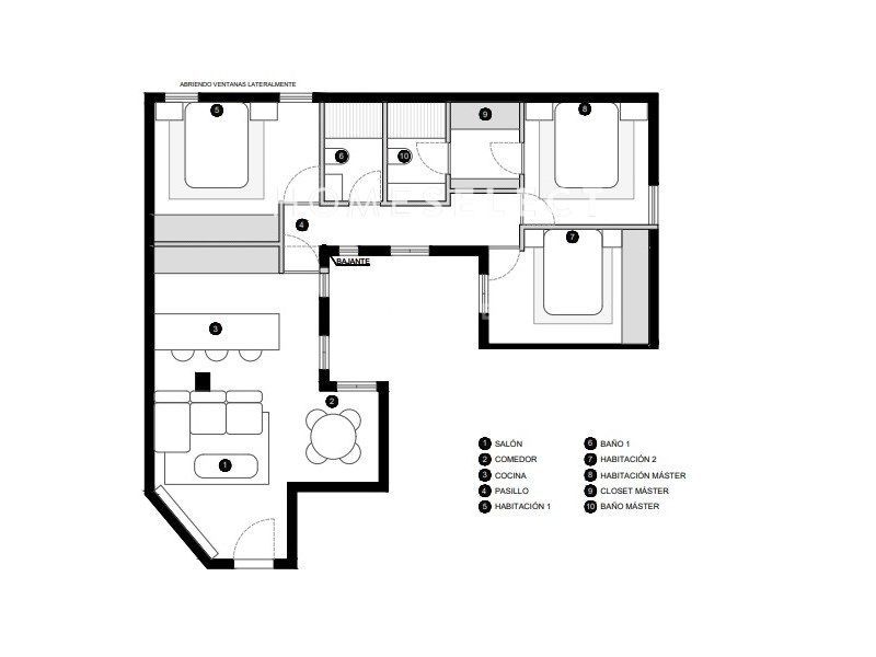 La vivienda presenta una distribución en forma de 'L' bien diferenciada la zona social y la zona privada. Al ingresar, se accede directamente a un área abierta que integra tres espacios conectados entre sí: una zona de estar, una zona de comedor y una cocina en línea. Esta área se beneficia de la entrada de luz natural gracias a la orientación de las ventanas. Desde este espacio principal, un pasillo central actúa como distribuidor hacia la zona privada. A lo largo de este pasillo se encuentran las estancias de descanso y los baños. Hay tres habitaciones en total. La habitación principal cuenta con acceso directo a un vestidor y a un baño privado. Las otras dos habitaciones comparten un baño común accesible desde el pasillo.