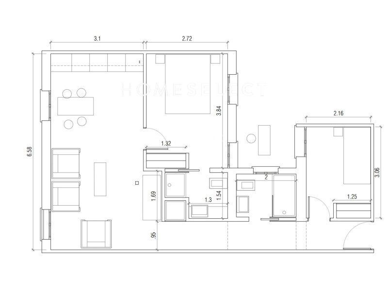 El baño completo se encuentra estratégicamente situado entre ambas zonas, accesible desde el pasillo distribuidor. También dispone de un espacio adicional como zona de lavandería o almacenamiento.