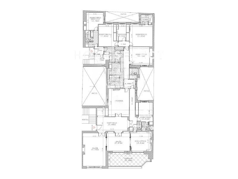 La vivienda se encuentra situada entre una octava y novena planta y cuenta con una terraza de 25m2. Se distribuye en 450 m2 de la siguiente manera: la zona de día está compuesta por 3 salones, un comedor, cocina con office y cuarto de lavandería. Además la terraza ofrece unas preciosas vistas completamente despejadas. Actualmente la zona de noche se compone de 6 dormitorios y 6 baños.