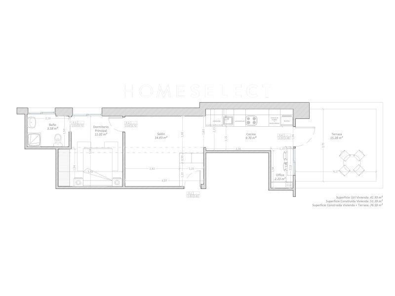 La distribución consta de una habitación espaciosa con baño en suite, un salón-comedor con cocina abierta semi-integrada y un espacio de office o desayuno con vistas a la terraza.