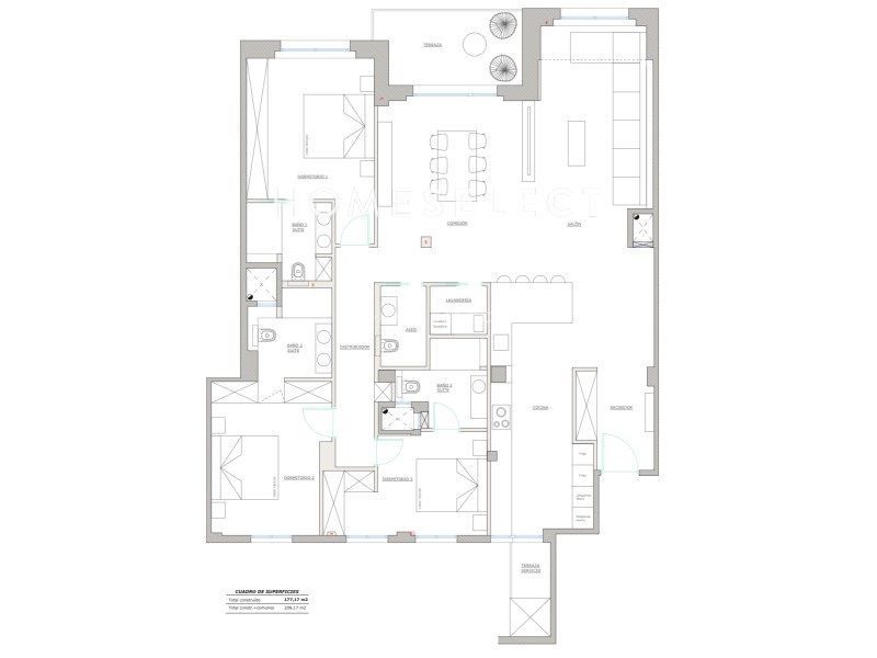 La vivienda se distribuye de la siguiente manera: accedemos a la vivienda y nos encontramos con un amplio recibidor con salón - comedor y una zona de bar que además cuenta con acceso a la cocina con una barra ancha para 4 comensales. A través de esta estancia, accedemos a una amplia terraza. Cuarto de lavandería independiente y aseo de cortesía. La zona de noche se compone de tres dormitorios, todos con baño en suite.
