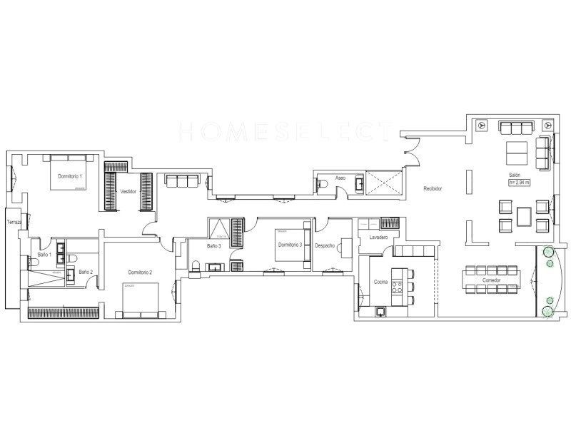 Se distribuye de la siguiente manera: en la zona de día, un gran recibidor nos conduce hasta el salón, exterior, dividido en dos ambientes y con dos grandes ventanales a la calle. Destaca por la altura de sus techos, de casi tres metros de altura. El comedor es independiente y está conectado con la cocina, equipada con todos los electrodomésticos y una isla central. Además de contar con una zona de lavandería al lado, la cocina está muy dotada de almacenaje. Un aseo de cortesía para los invitados dentro del área social. En la zona de noche, tres dormitorios dobles cada uno con su baño en suite. El principal también cuenta con un gran vestidor y tiene salida a una pequeña terraza de unos 6 metros aproximadamente. Adicionalmente, acoge un despacho y un family room.