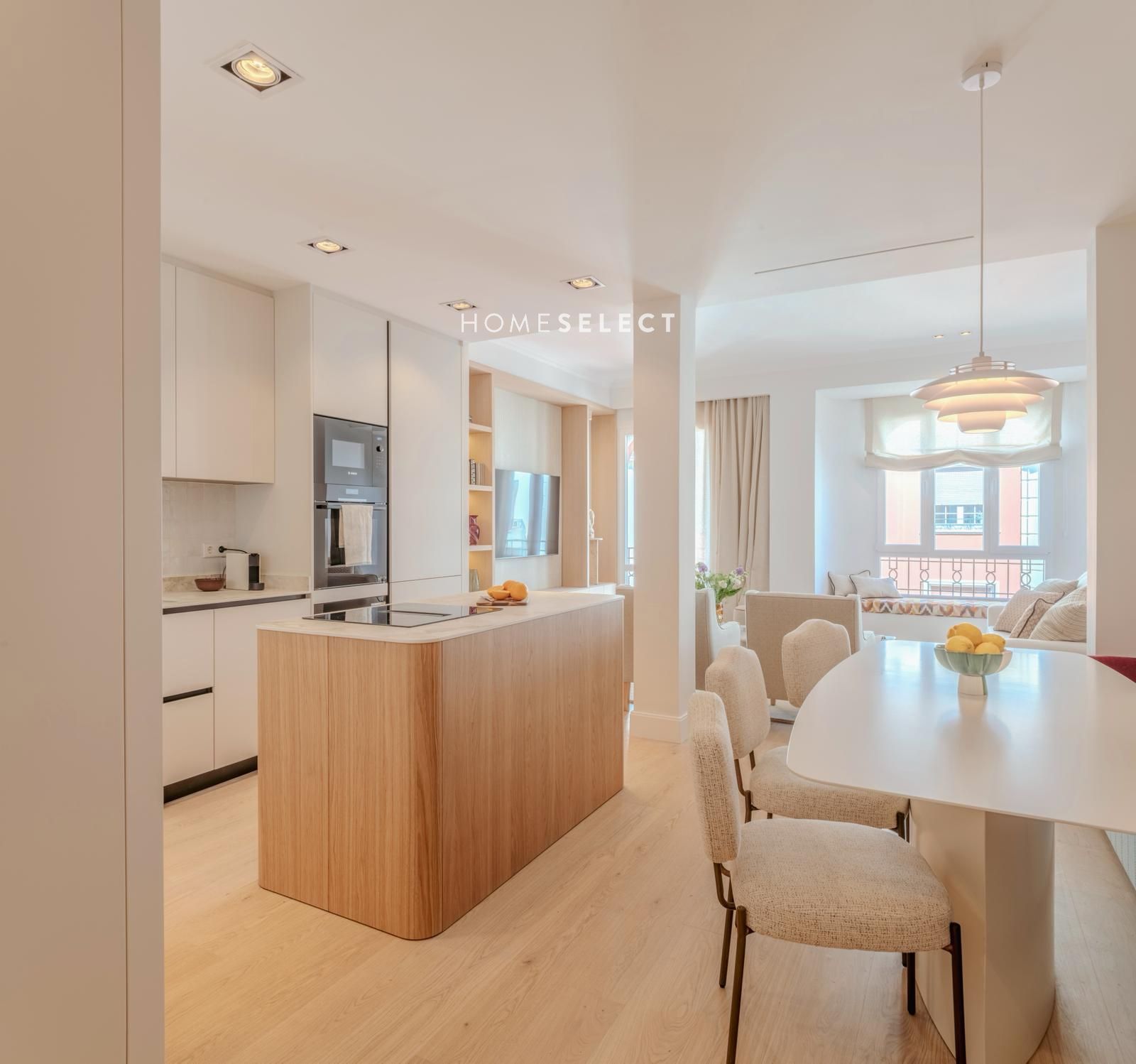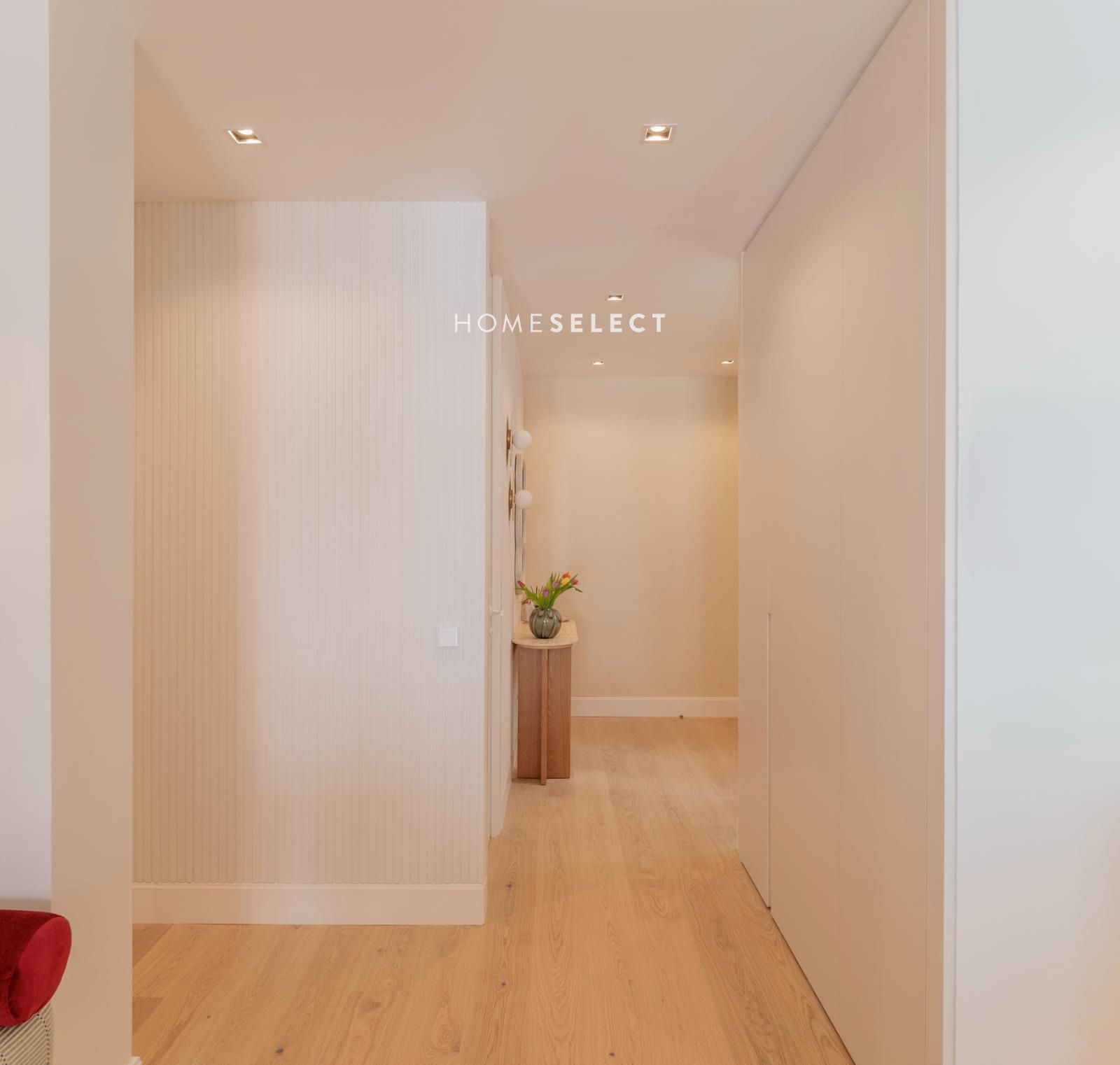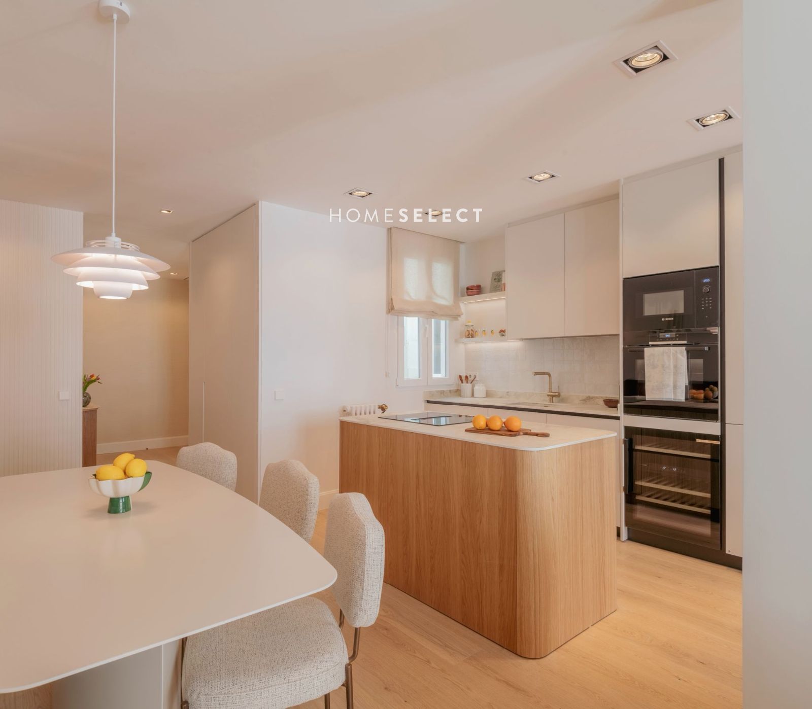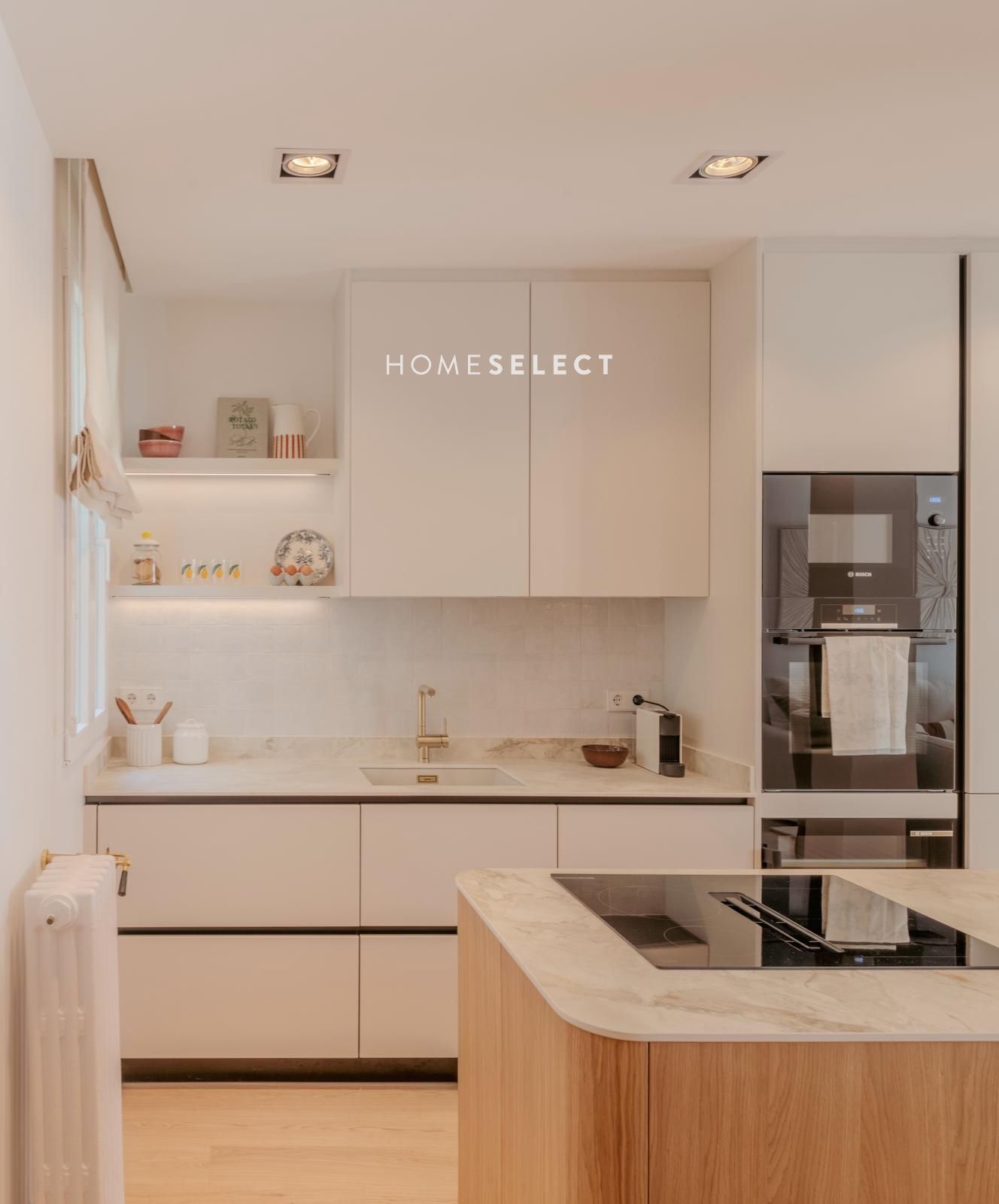 La vivienda cuenta con puerta de acceso blindada y suelos de tarima de madera natural en tono roble, que aportan calidez y continuidad a todos los espacios. Las paredes en pintura lisa en tonos neutros se combinan con empapelados y revestimientos seleccionados, generando una atmósfera equilibrada y atemporal. Los cielorrasos de pladur incorporan iluminación empotrada, reforzando una estética limpia y contemporánea. Dispone de ventanas de PVC con doble acristalamiento y rotura de puente térmico, nueva instalación eléctrica y sanitaria, calefacción central con radiadores en todas las estancias y agua caliente individual. El sistema de climatización es por conductos frío-calor con control independiente por estancias mediante Airzone. La vivienda incorpora además sistema de domótica, que permite gestionar de forma eficiente distintos elementos del hogar, aportando confort y funcionalidad en el día a día. La cocina, de diseño contemporáneo, ha sido realizada íntegramente a medida, con mobiliario lacado, isla en madera de roble, encimera de porcelánico y electrodomésticos de primeras marcas integrados. Los rodapiés lacados en blanco acompañan la carpintería interior, también lacada en tonos claros, con cerraduras imantadas y bisagras ocultas. Los dormitorios disponen de amplios armarios empotrados diseñados a medida. En la habitación principal destacan las puertas en roble macizo y cristal acanalado, mientras que en la secundaria y resto de la vivienda predominan puertas lacadas en tonos claros con interiores en madera laminada textura lino, combinando estética y funcionalidad.