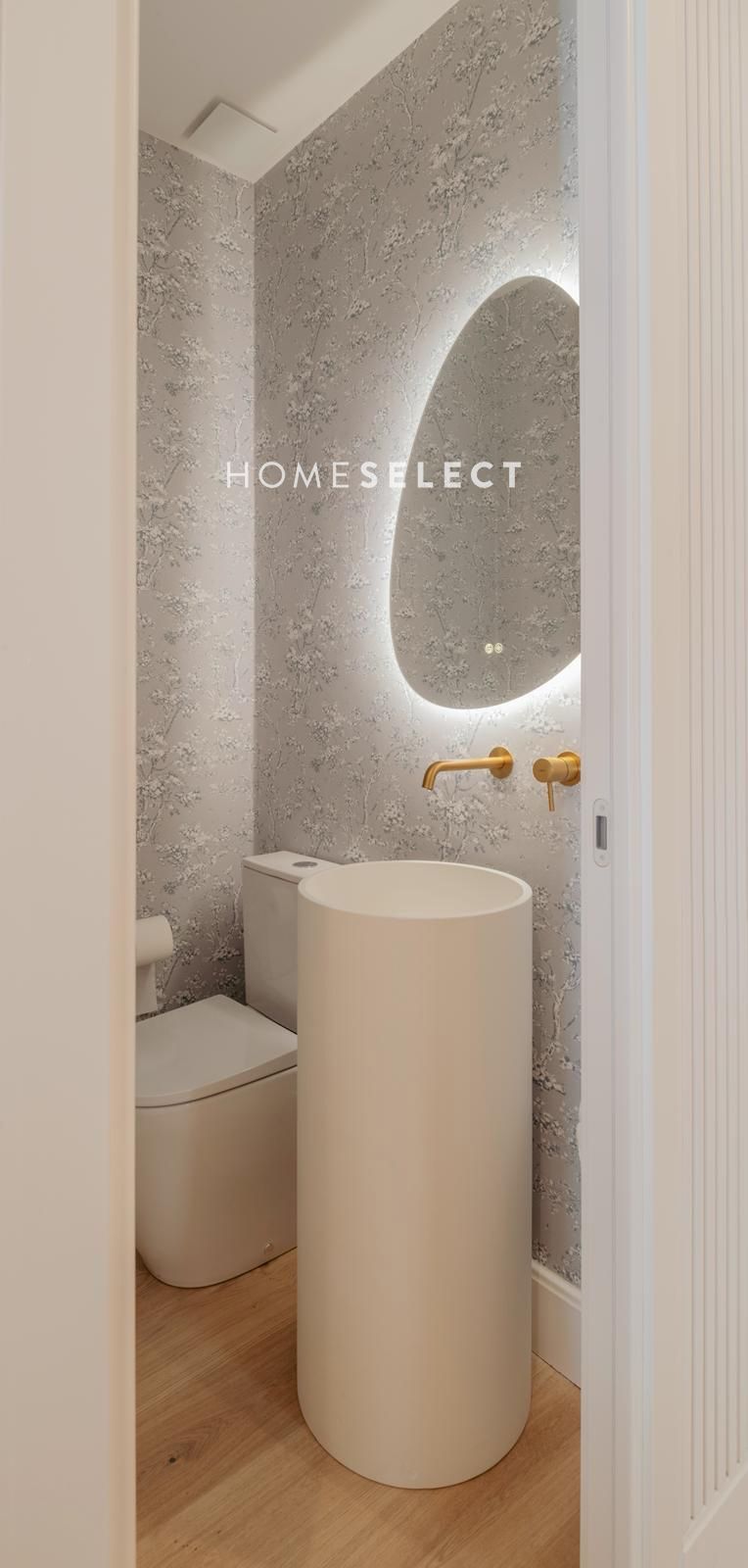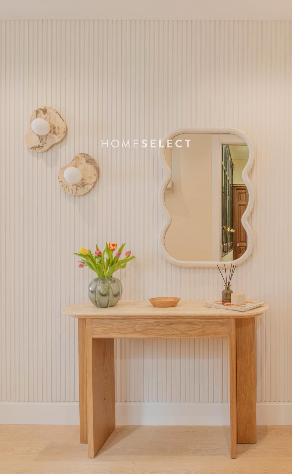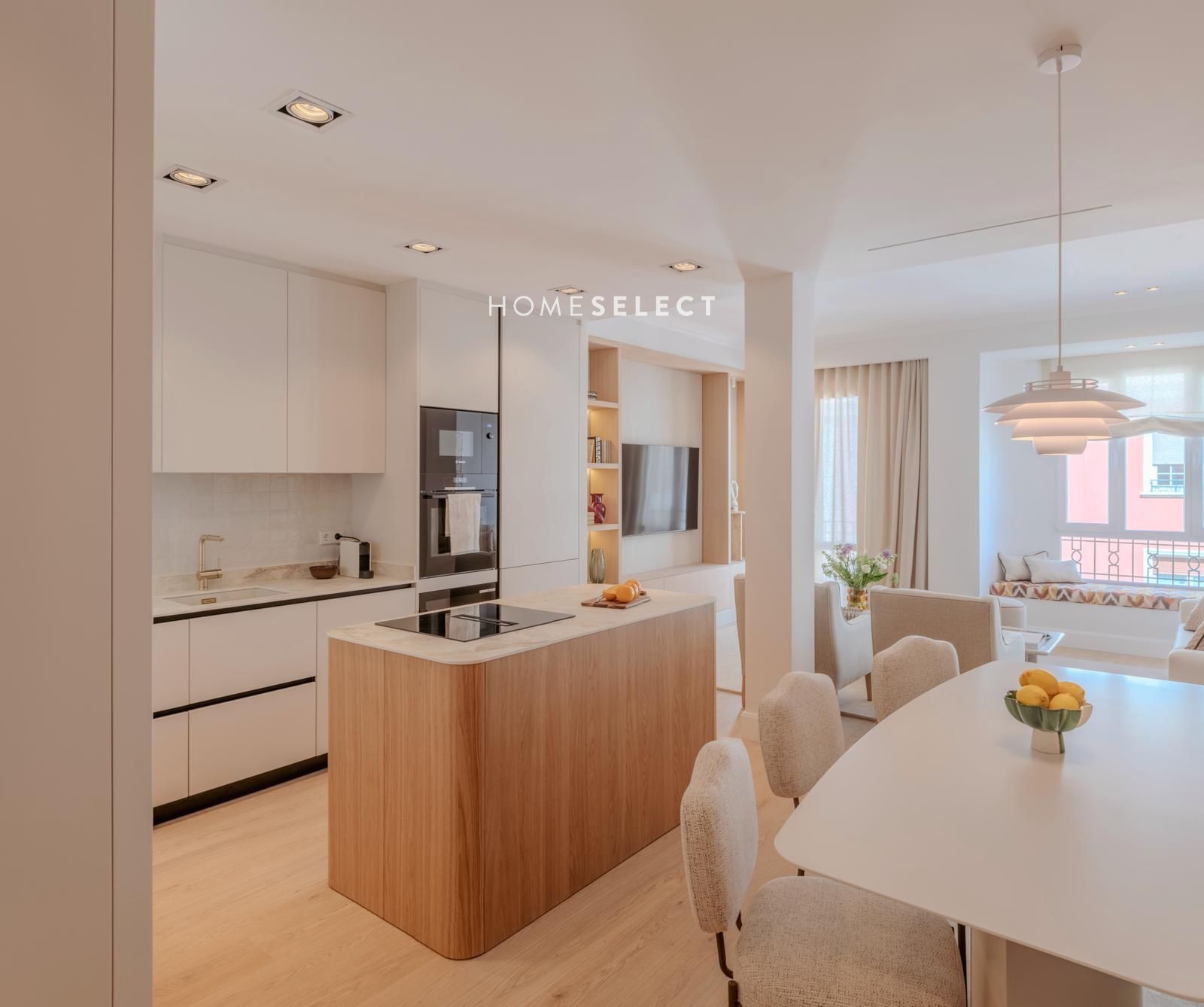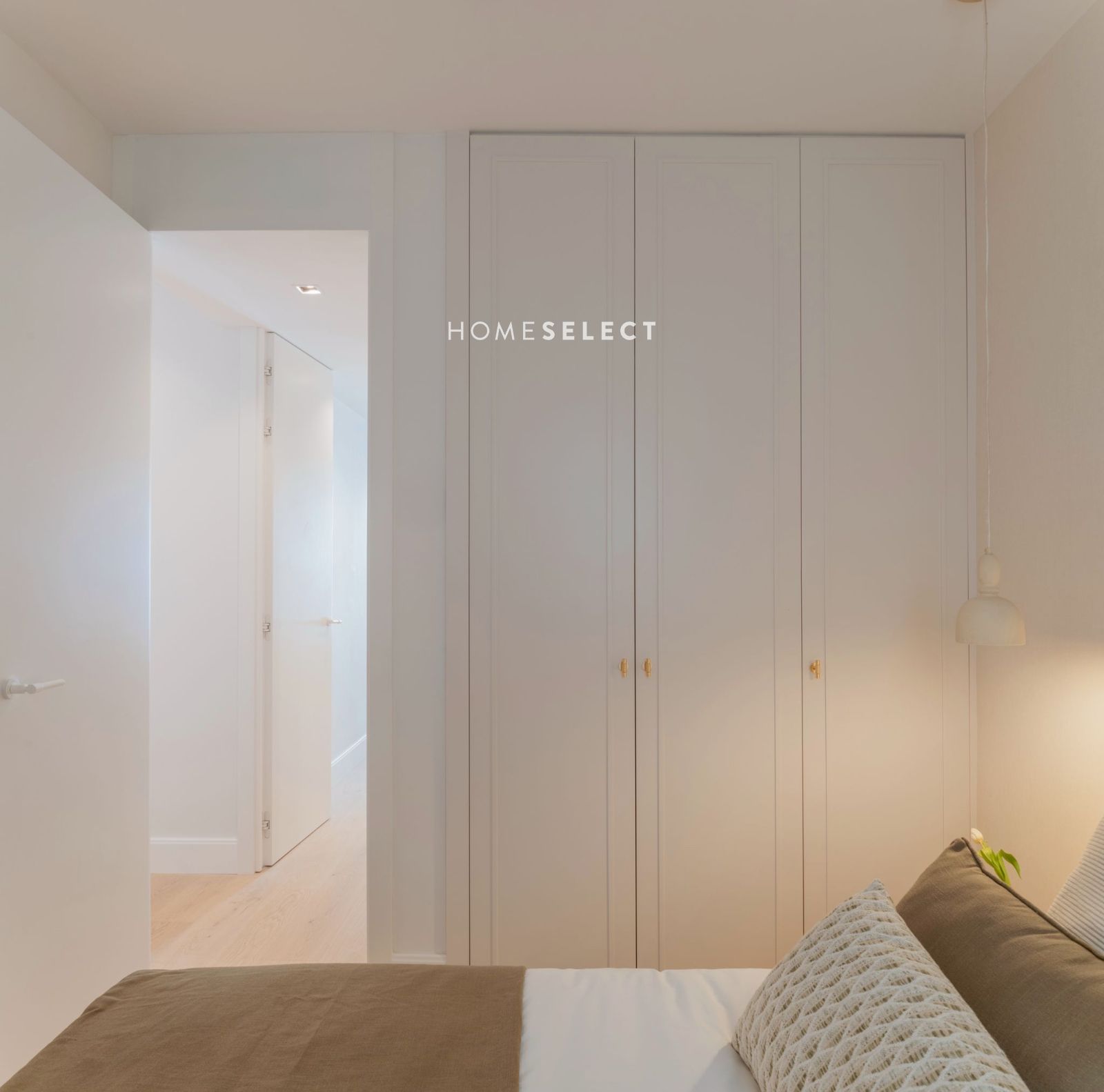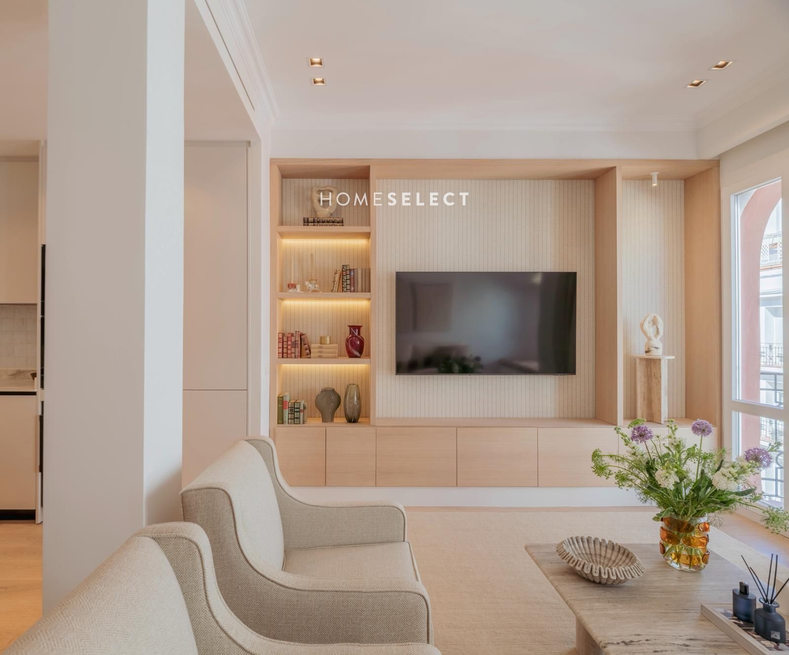 La vivienda cuenta con puerta de acceso blindada y suelos de tarima de madera natural en tono roble, que aportan calidez y continuidad a todos los espacios. Las paredes en pintura lisa en tonos neutros se combinan con empapelados y revestimientos seleccionados, generando una atmósfera equilibrada y atemporal. Los cielorrasos de pladur incorporan iluminación empotrada, reforzando una estética limpia y contemporánea. Dispone de ventanas de PVC con doble acristalamiento y rotura de puente térmico, nueva instalación eléctrica y sanitaria, calefacción central con radiadores en todas las estancias y agua caliente individual. El sistema de climatización es por conductos frío-calor con control independiente por estancias mediante Airzone. La vivienda incorpora además sistema de domótica, que permite gestionar de forma eficiente distintos elementos del hogar, aportando confort y funcionalidad en el día a día. La cocina, de diseño contemporáneo, ha sido realizada íntegramente a medida, con mobiliario lacado, isla en madera de roble, encimera de porcelánico y electrodomésticos de primeras marcas integrados. Los rodapiés lacados en blanco acompañan la carpintería interior, también lacada en tonos claros, con cerraduras imantadas y bisagras ocultas. Los dormitorios disponen de amplios armarios empotrados diseñados a medida. En la habitación principal destacan las puertas en roble macizo y cristal acanalado, mientras que en la secundaria y resto de la vivienda predominan puertas lacadas en tonos claros con interiores en madera laminada textura lino, combinando estética y funcionalidad.