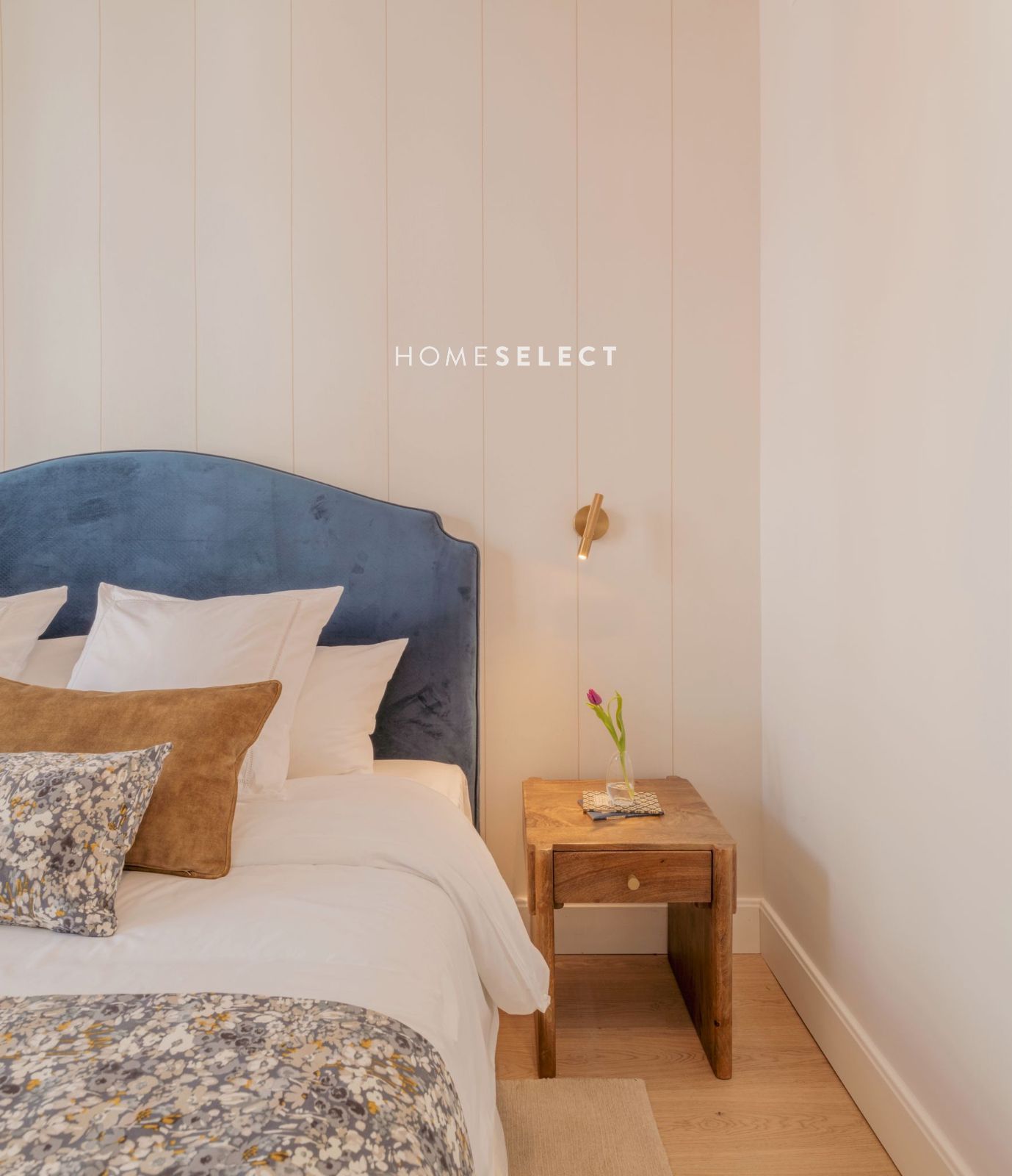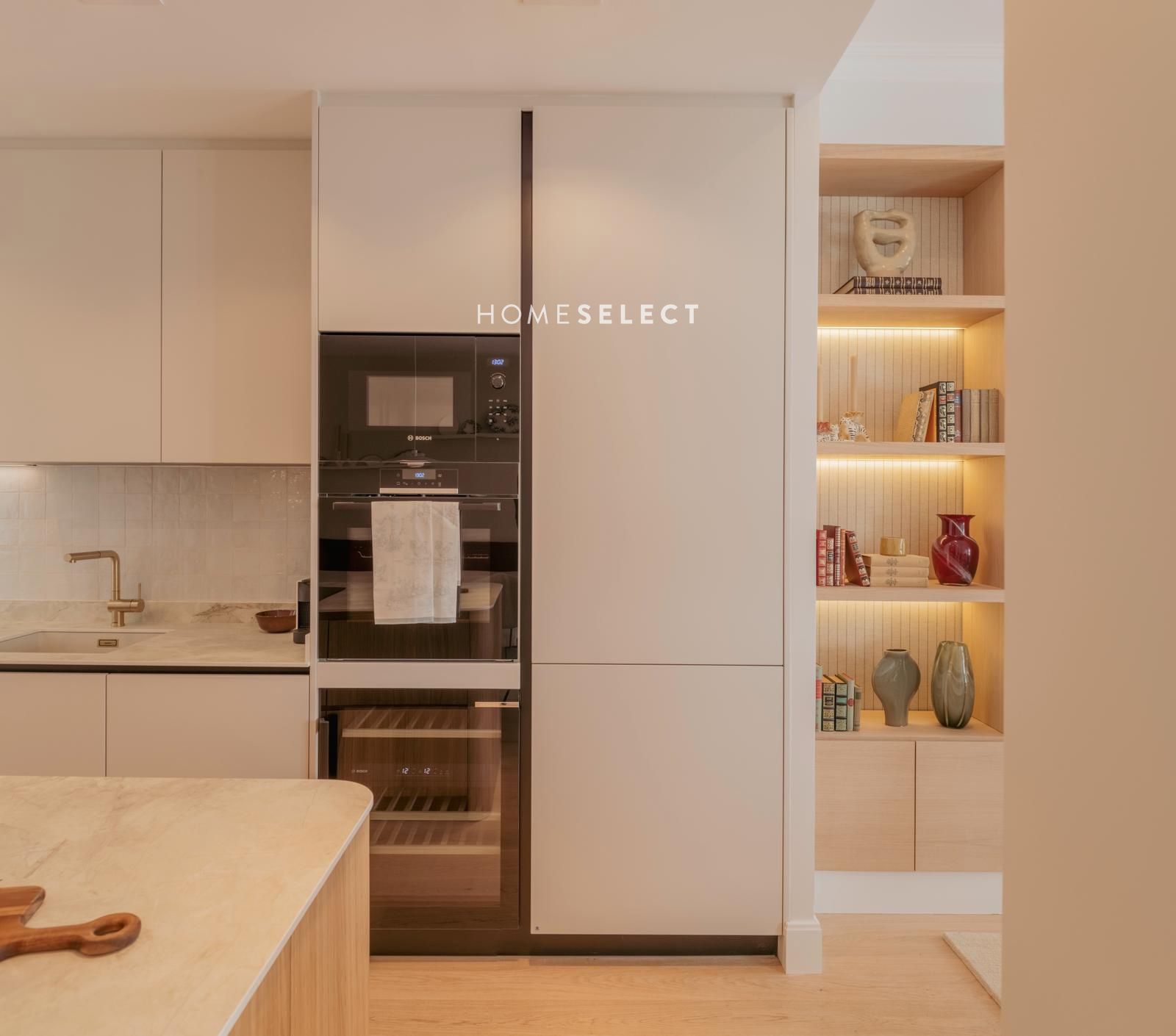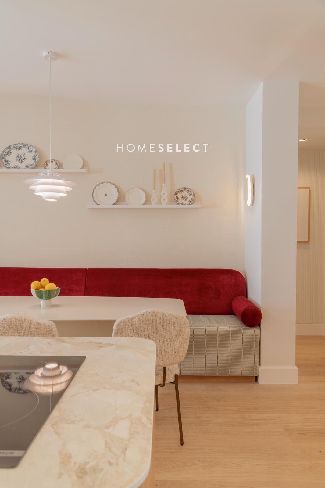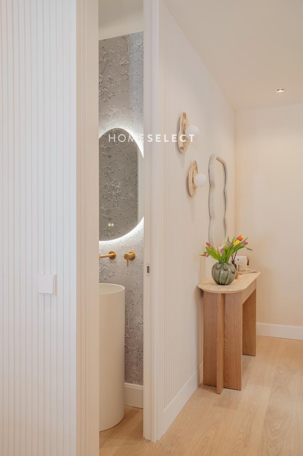 La vivienda cuenta con puerta de acceso blindada y suelos de tarima de madera natural en tono roble, que aportan calidez y continuidad a todos los espacios. Las paredes en pintura lisa en tonos neutros se combinan con empapelados y revestimientos seleccionados, generando una atmósfera equilibrada y atemporal. Los cielorrasos de pladur incorporan iluminación empotrada, reforzando una estética limpia y contemporánea. Dispone de ventanas de PVC con doble acristalamiento y rotura de puente térmico, nueva instalación eléctrica y sanitaria, calefacción central con radiadores en todas las estancias y agua caliente individual. El sistema de climatización es por conductos frío-calor con control independiente por estancias mediante Airzone. La vivienda incorpora además sistema de domótica, que permite gestionar de forma eficiente distintos elementos del hogar, aportando confort y funcionalidad en el día a día. La cocina, de diseño contemporáneo, ha sido realizada íntegramente a medida, con mobiliario lacado, isla en madera de roble, encimera de porcelánico y electrodomésticos de primeras marcas integrados. Los rodapiés lacados en blanco acompañan la carpintería interior, también lacada en tonos claros, con cerraduras imantadas y bisagras ocultas. Los dormitorios disponen de amplios armarios empotrados diseñados a medida. En la habitación principal destacan las puertas en roble macizo y cristal acanalado, mientras que en la secundaria y resto de la vivienda predominan puertas lacadas en tonos claros con interiores en madera laminada textura lino, combinando estética y funcionalidad.
