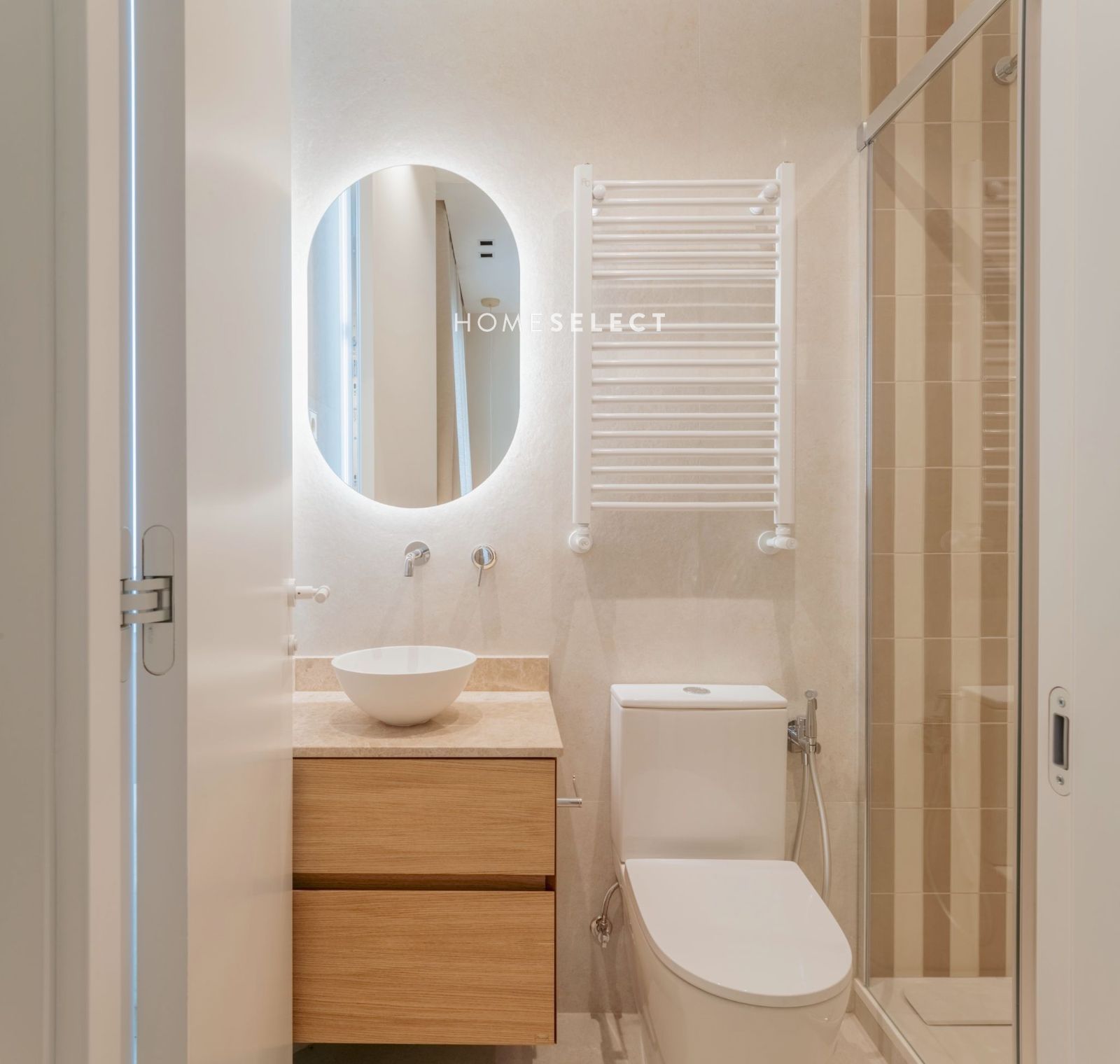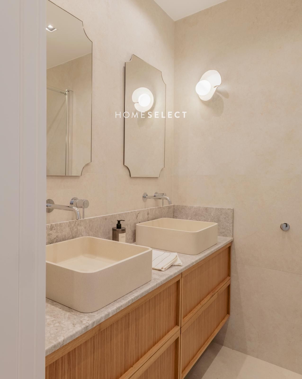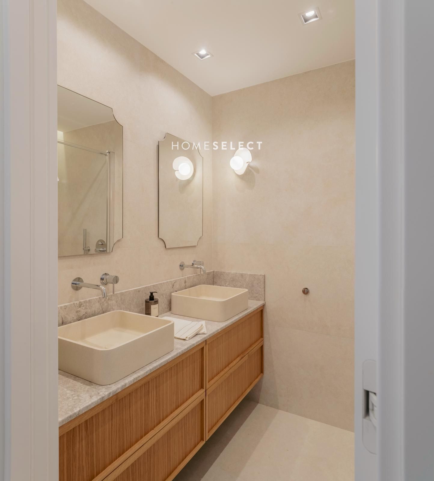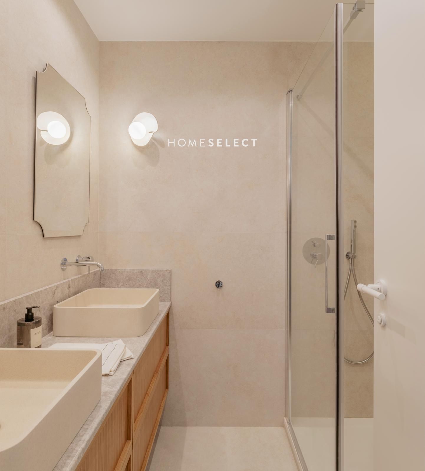 Los baños, revestidos con porcelánicos de primera calidad, incorporan muebles de lavabo a medida con encimeras de piedra natural, platos de ducha en resina con mampara, griferías seleccionadas, radiadores toallero y accesorios cuidadosamente elegidos.